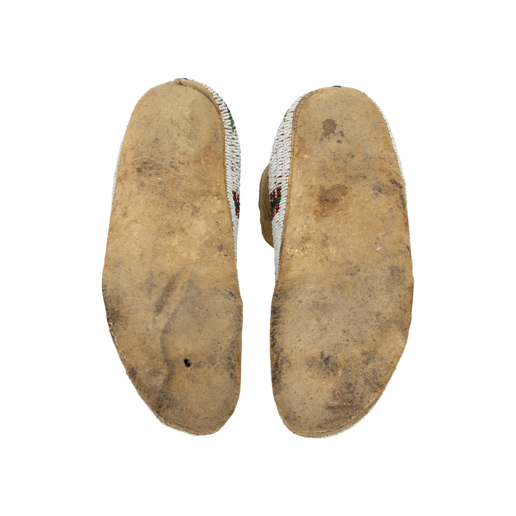 Sioux moccasins made from brain tanned buffalo and sinew sewn with buffalo hoof design. Beaded in green, red, white and various blues.
