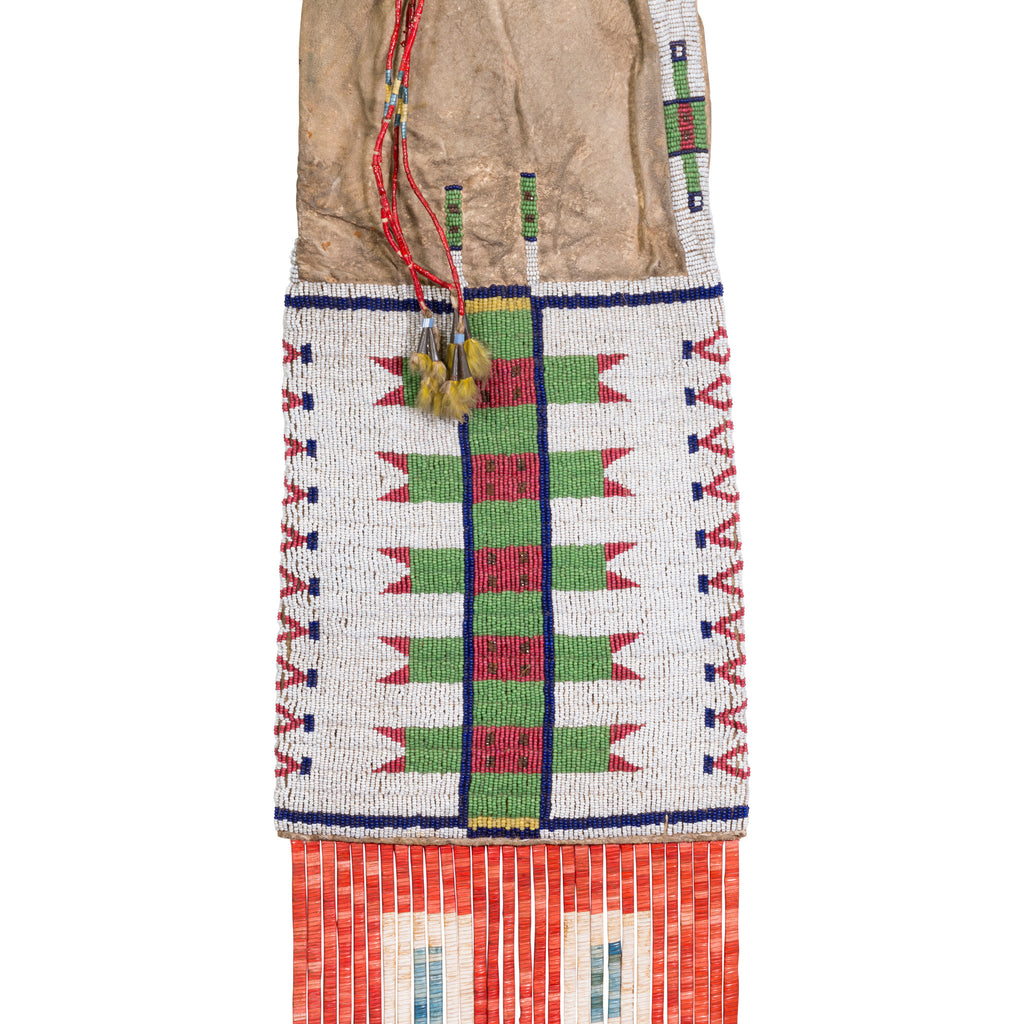 Highly visual Sioux made pipe bag. Identical beading both sides. Parfleche quilled slats and brain tanned fringe. Beaded upper sides and rim. Quilled drop with tin cones and yellow feather fluffs on top tie. Bag 19" x 8" slats 5" fring 11" overall 34".