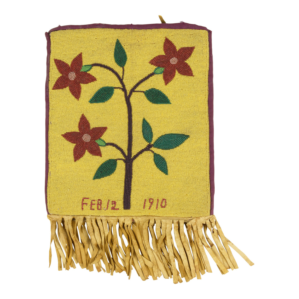 Yakama flat bag with floral design and yellow background. Dated Feb 12, 1910. Commercially tanned fringe and backing.