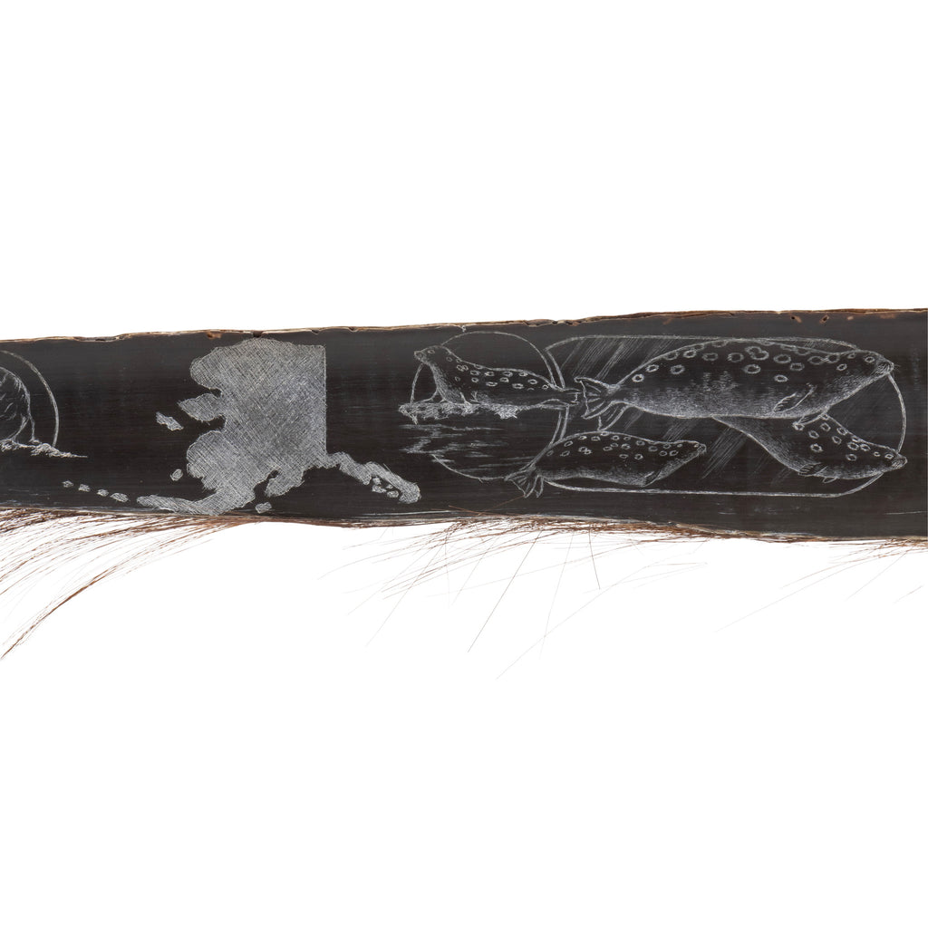 Alaskan Baleen. An exceptional piece of scrimshawed Alaskan baleen with "Alaska" walrus. Image of state and seals. Signed Art Nigailou. 39"