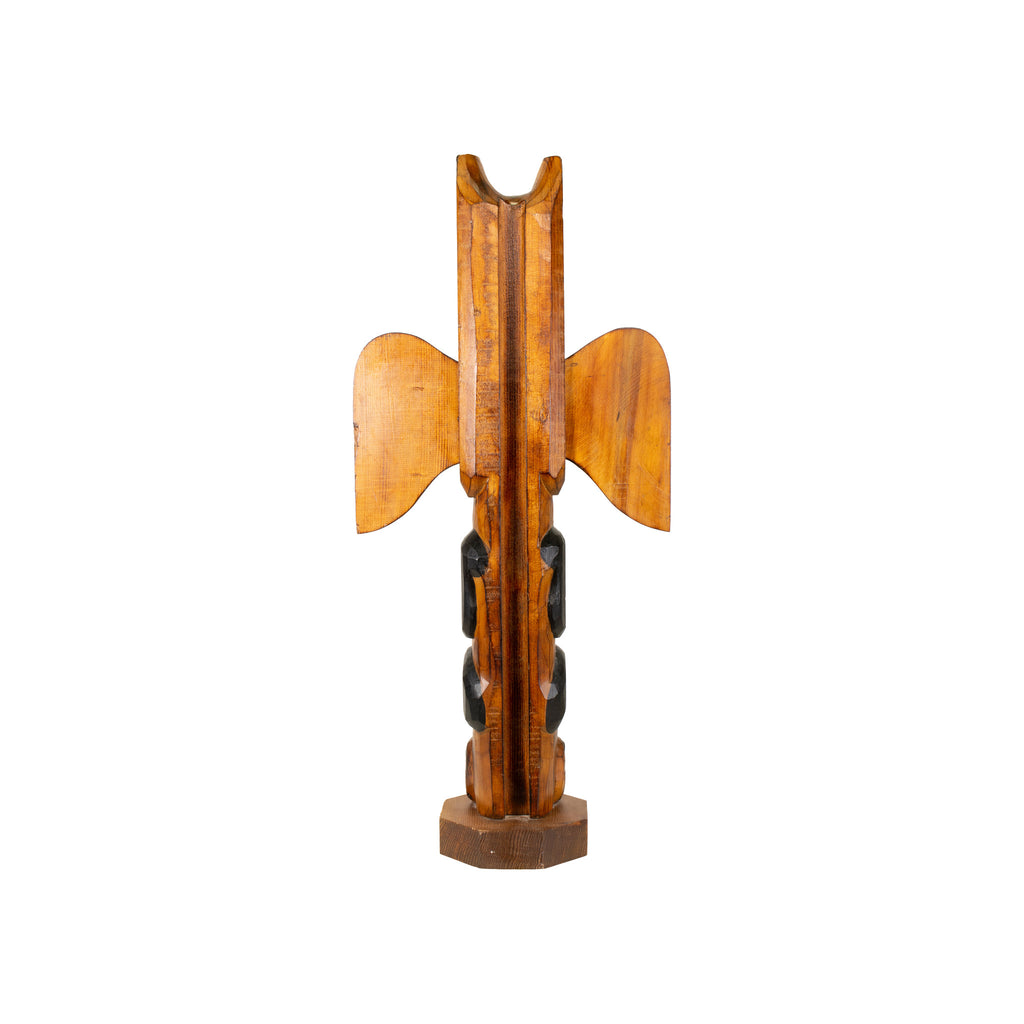 Alaskan black diamond hand carved totem pole from Alaskan yellow cedar. Not Native carved. Made for and marketed in a souvenir shop in Ketchikan, Alaskan. Features motif from a legend of "Fog Woman." On the undersigned it is signed by "Patrick Seale" and includes a small pamphlet with the legend that reads: The Legend of Fog Woman - Raven and his two men wre fishing in a canoe. They had travelled further out in the water than they had ever gone before. Soon they were engulfed by a dense fog. The fog was so dense that the trio lost their balance and did not know where they were. Suddenly, on the bow of the canoe appeared a beautiful woman. "I will show you the way to my village and to safety," she said. Of course, Raven and the men followed her. After a short time, Raven fell in love with Fog Woman, and they were married. They were very happy until a food shortage befell the village. Everyone was short of food except Fog Woman, who always had plenty of salmon in her cooking pot. Being a very curious creature, Raven follows Fog Woman to the creek. There he witnesses her swirl her fingers in the water and out jump beautiful salmon. He asks how she makes this happen, but she won't tell him. Raven grumbles and returns to the village. Again, Raven asks how she produces the salmon. She refuses to tell him. This time Raven says "If you won't tell me, then be gone!" At this she turns into Fog and rolls out to sea calling "I will come to you only as Fog, but I will return salmon to the streams each year so you and the village will have plenty of food." That is how we get Salmon and Fog today. This hand carved totem is made of old growth Native yellow cedar grown deep in the rain forests of Southeast Alaska.