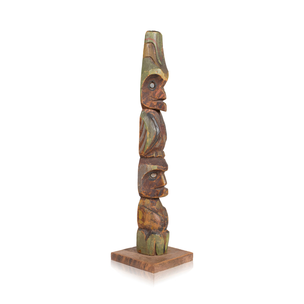 Coast Salish of Nuu-chah-nulth two-figure totem pole. An older two-figure model pole that depicts a bird with a large crest and an anthropomorphized face over a humanoid figure. This pole is carved in yellow cedar with a rich patina and is painted in old green, yellow, red, and black pigments. The circular eyes and somewhat simplified sculpture on this pole point to a likely Coast Salish origin, although it’s possible that it is Nuu-chah-nulth. 12 1/4"