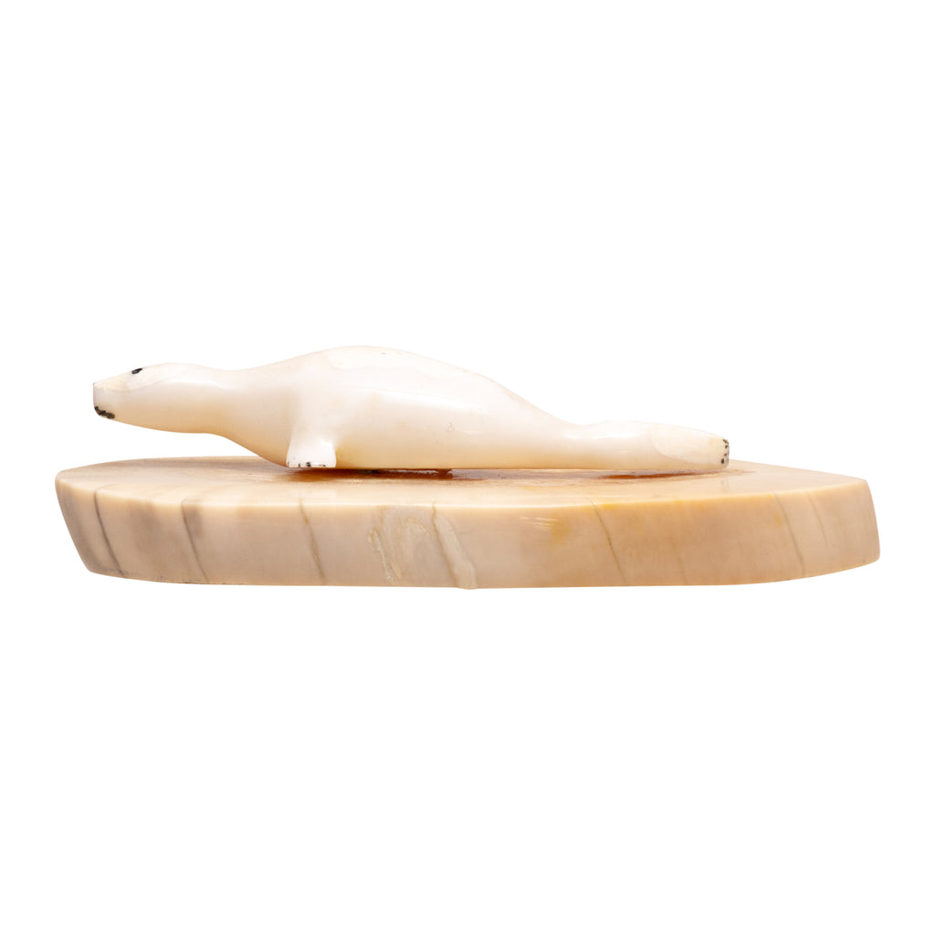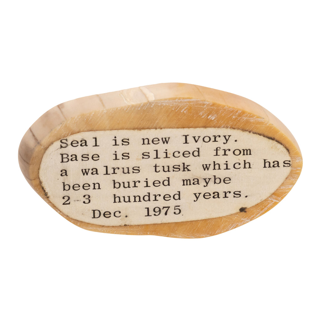 Inuit carved walrus ivory sea on prehistorc tusk slice. Noted on bottom "seal is new ivory, base is sliced from a walrus tusk which has been buried 200-300 years. DEC. 1975."