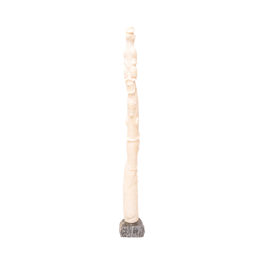 Inuit carved walrus ivory pictorial totem with man faces, wolves, eskimo, and polar bear at the top. Was broken and glued. On green stone base.