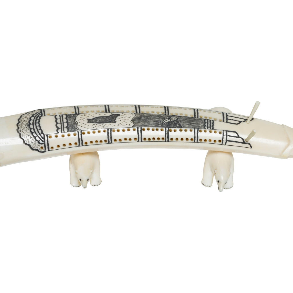 Inuit carved and scrimshawed walrus ivory cribbage board. Carved with a fish at point. Scrimshawed with sea lions supported by two polars bear.