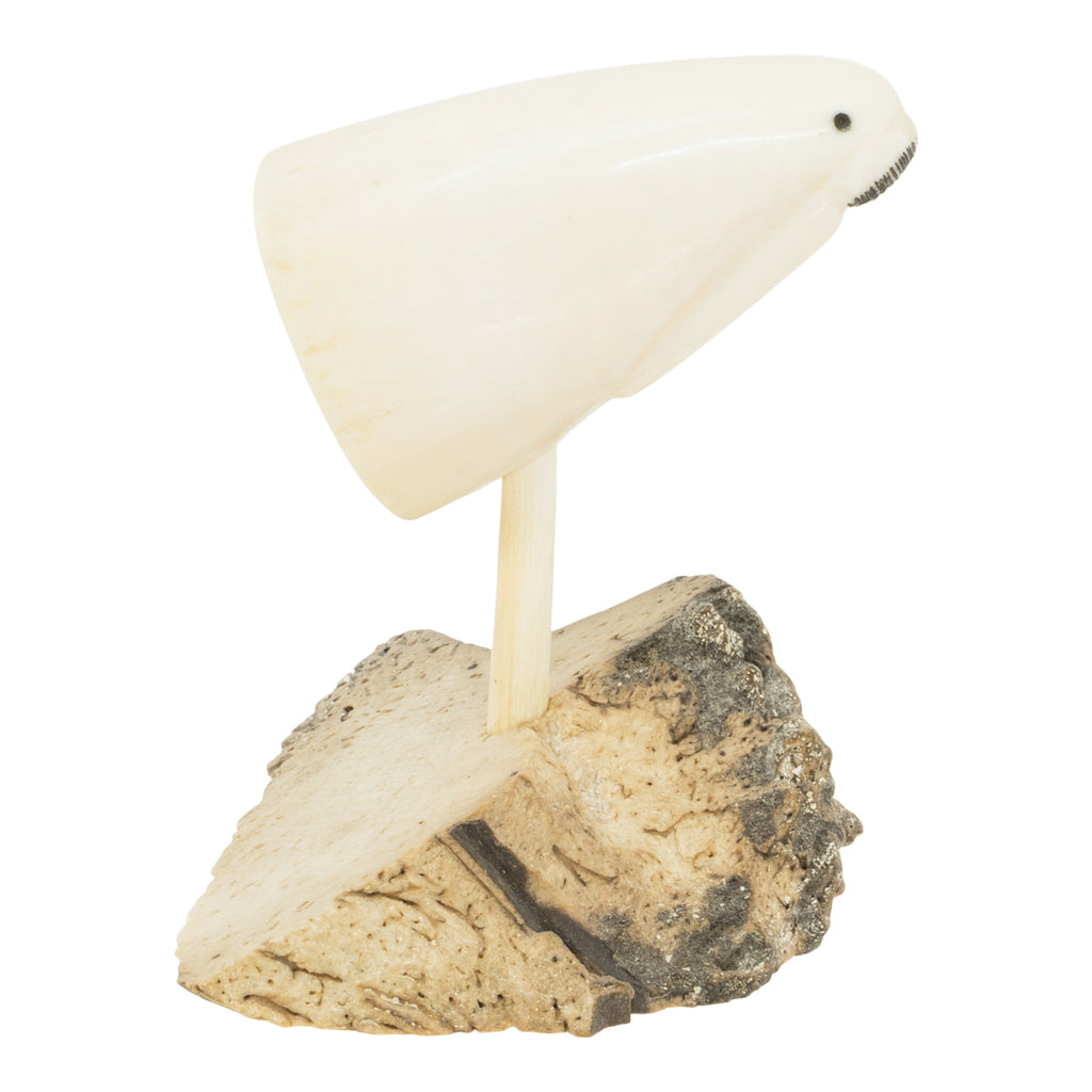 Miniature Inuit carved walrus ivory walrus head on fossilized bone base. These carvings were usually small carvings from walrus ivory, representing local animals and Inuit themselves, going about everyday life. Seals, caribou, polar bears, birds, and other animals important to Inuit’s survival were often represented.