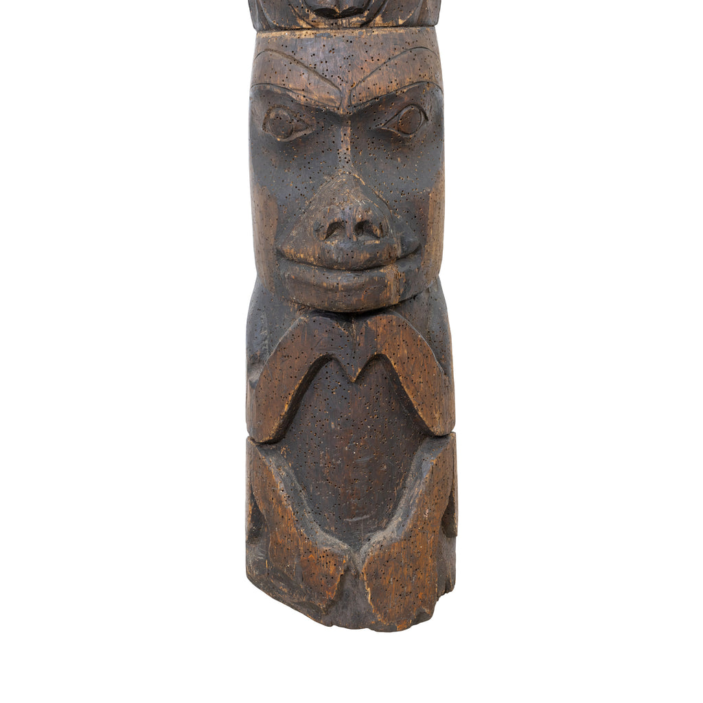 Please note: The human face of the bird is skillfully carved with excellent proportions, but the eyes and nose do not appear to be complete. The wings are also blank, where they would have perhaps had formline designs carved into them. The legs, hands, and feet of the bear look similarly unfinished. There are a lot of reasons why this could be the case, but most often it was because someone wanted to buy the carving while they were visiting the Northwest Coast and the carver was not finished with the piece. In those instances, the artist would often finish the most crucial features, like the face of the Bear, and sell the carving to the visitor as-is. In this case, it is just an interesting feature of the life of this fine totem pole. From an important Vancouver, BC collection. 43"H x 9"W