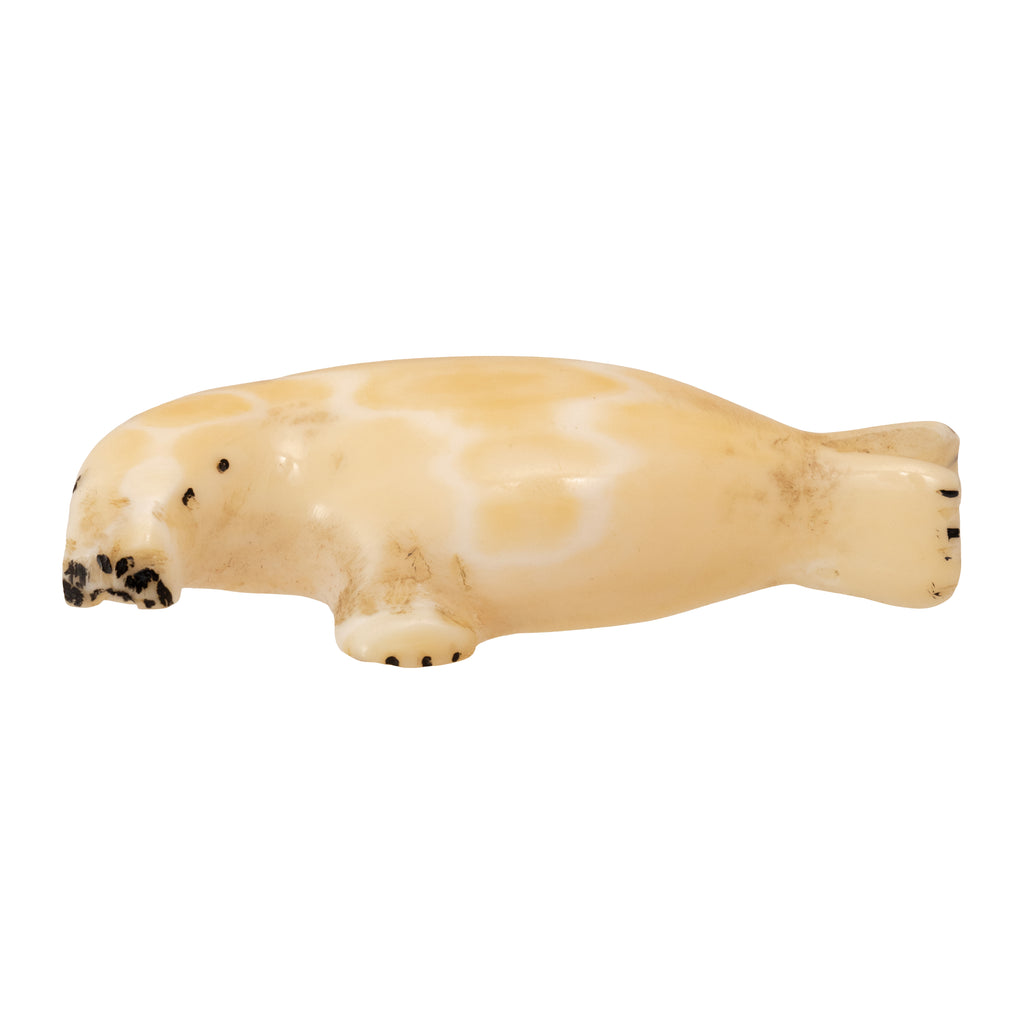 Miniature Inuit carved fossilized walrus ivory seal. Smooth finish, baleen eyes and claws. No maker's mark. These carvings were usually small carvings from walrus ivory, representing local animals and Inuit themselves, going about everyday life. Seals, caribou, polar bears, birds, and other animals important to Inuit’s survival were often represented.