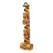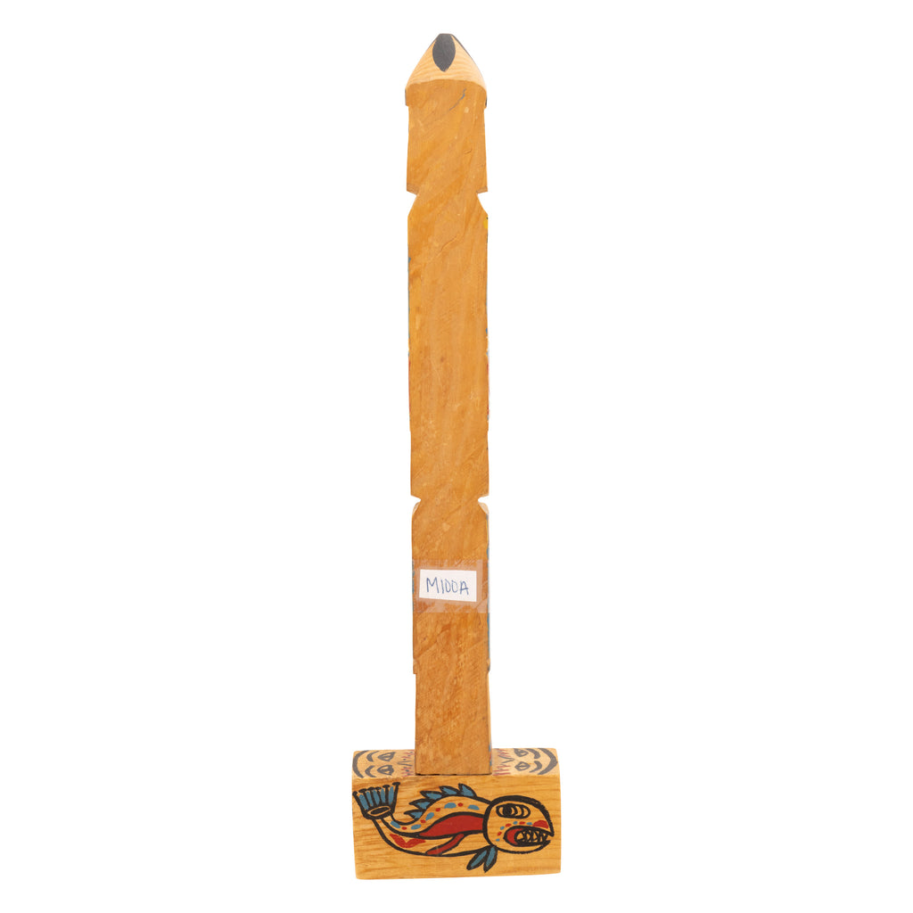 This model pole is carved in yellow cedar and depicts a truncated version of the Tlingit Chief Shakes Totem from Wrangell, Alaska. It was created by a member of the Nuu-chah-nulth Amos family of carvers who worked for Ye Olde Curiosity Shop in the mid-20th century. Although the Amos family were known for elaborate painting work on their poles, this really takes it to the next level. The pole and the base are covered in images of sea monsters, fish, whales, and human faces – even on the bottom of the base! The colorful line drawings on this pole recall the figural basketry patterns on Nuu-chah-nulth and Makah baskets from the same time period. In excellent condition with bright paint and wood throughout. 12"
