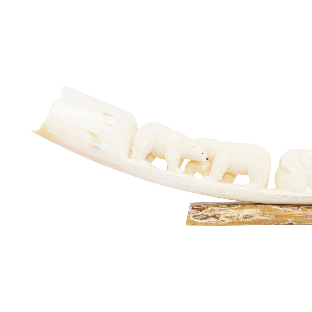 Ronald Apangalook (1968- ) walrus ivory carving of a three dimensional line of polar bears on fossilized ivory base. Signed Qay. Ronald (Eskimo name Qaygeghutkaq, shortened to Qay - literal translation “put on top”) was born in 1968, a Siberian Yupik from the Village of Gambell located on St. Lawrence Island. He began developing his artist talent for carving in 1991 while attending college in Anchorage. Today he is recognized for his superbly carved figurines and exceptional sculptures depicting otters, bears, cormorants, puffins, hunters and walruses. 31" x 7"