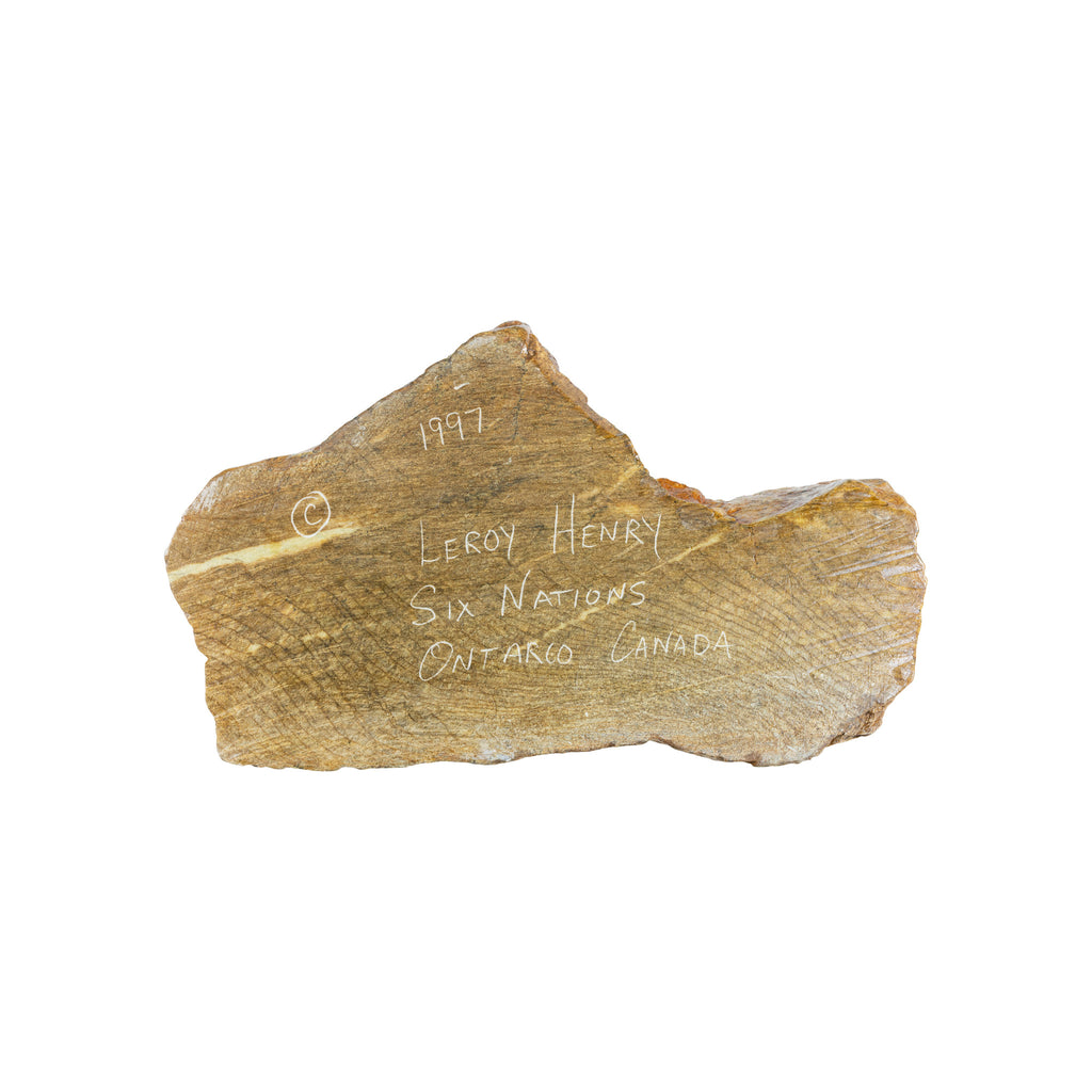 Soapstone carving of three bear cubs overlooking a salmon stream. Consists of an irregular shaped base carved with three bears facing left and standing belly deep in the current of a stream. A leaping salmon faces upstream near the front left edge. Coloration of the stone is brown except for the light gray surface of the water. Carved by Leroy Henry. Inscribed "c 1997, LEROY HENRY, SIX NATIONS, ONTARIO CANADA." 1" x 7"W x 1 1/2" thick base