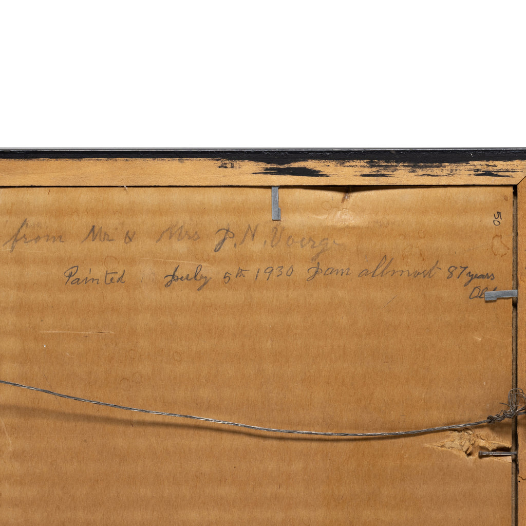 Folk art bird painting. 8" x 15". Framed. Hand painted original Folk Art. Parrot looks like a vulture. Noted on back "From Mr. and Mrs. P. N. Voirge, painted July 5, 1930. I'm almost 87 years old."