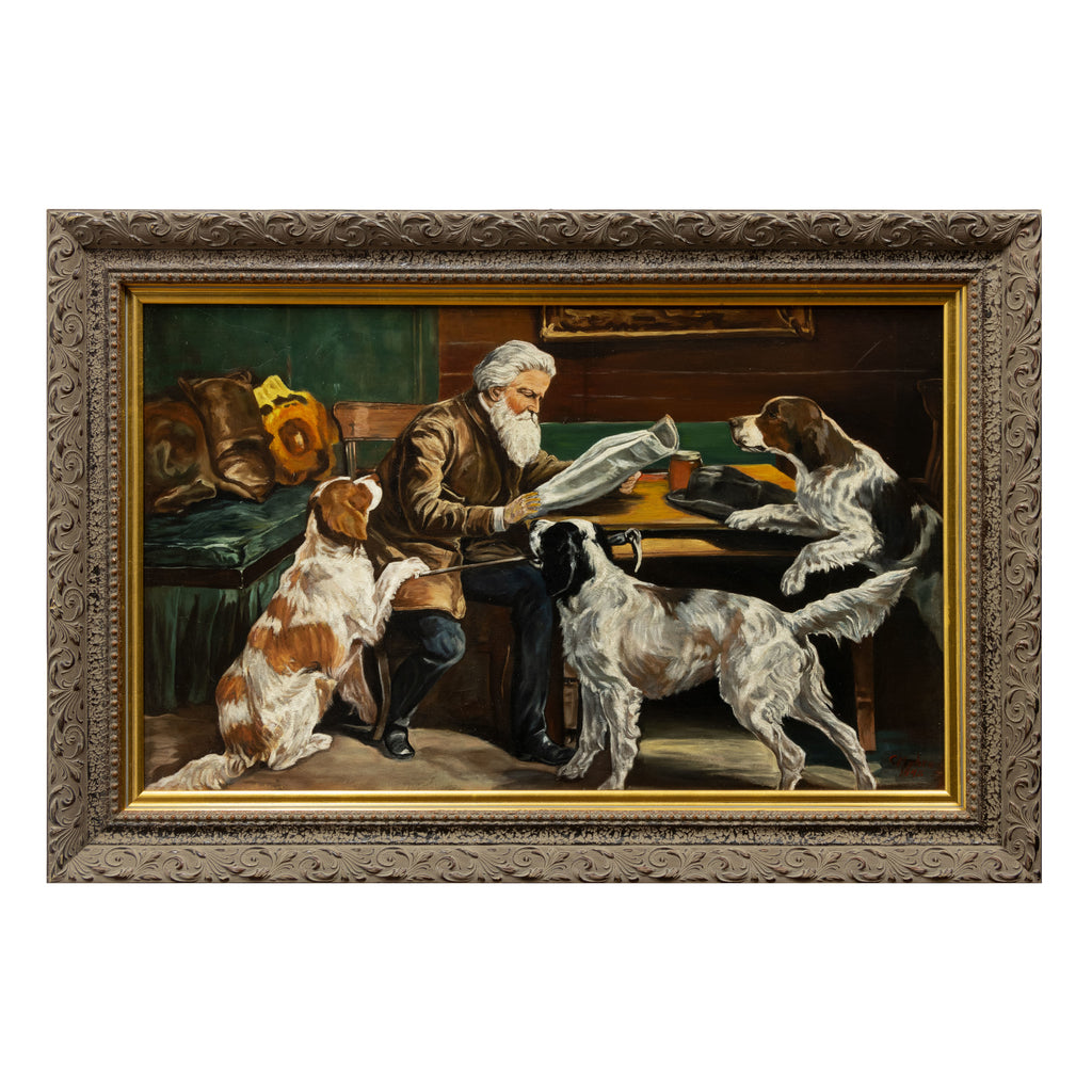 (1945- ) In the style of Edmond Ostous. Oil on canvas; 32” x 20”. Accompanied by advertising chromo lithograph Thos. W. Fatheringham. Sight 17” x 10 ½”.