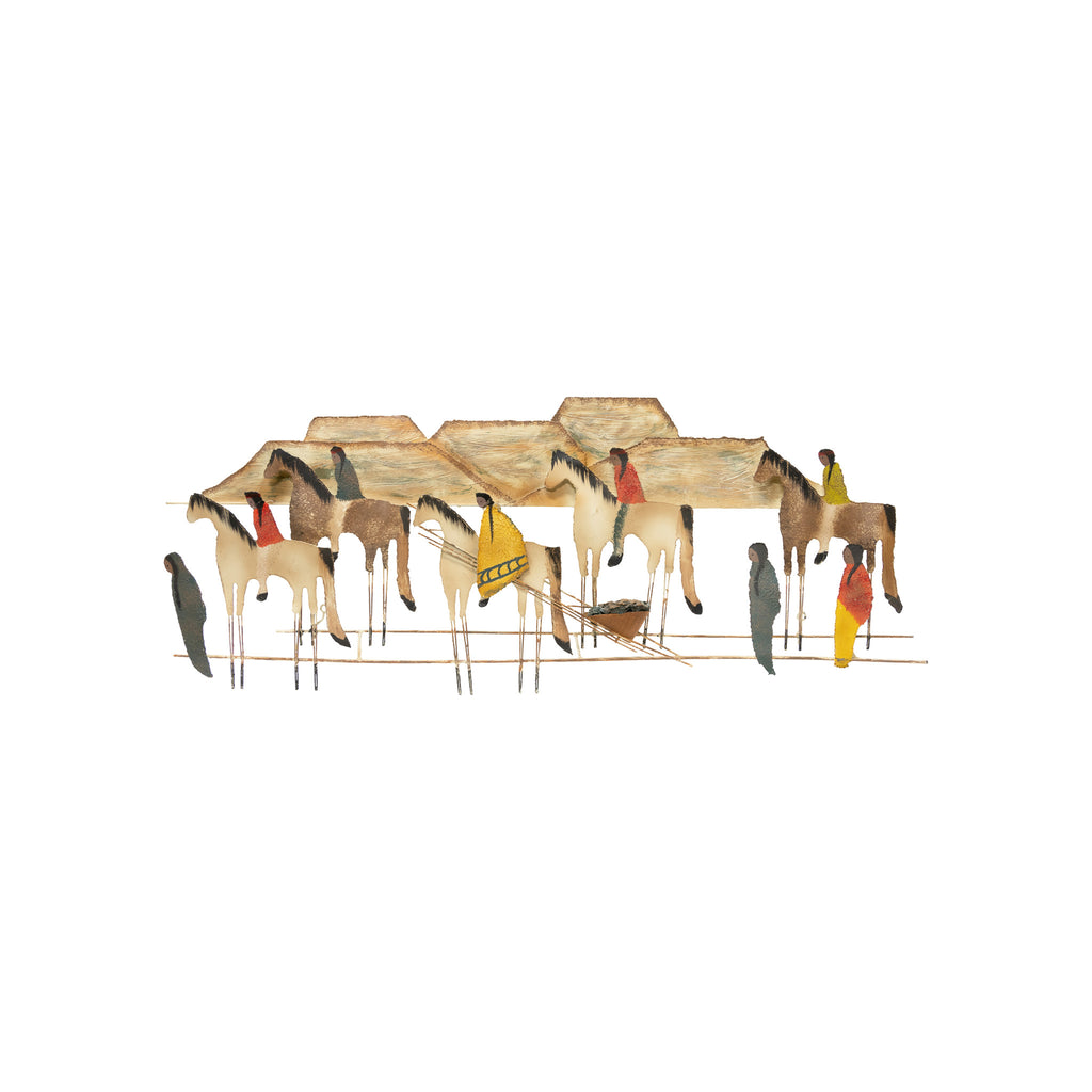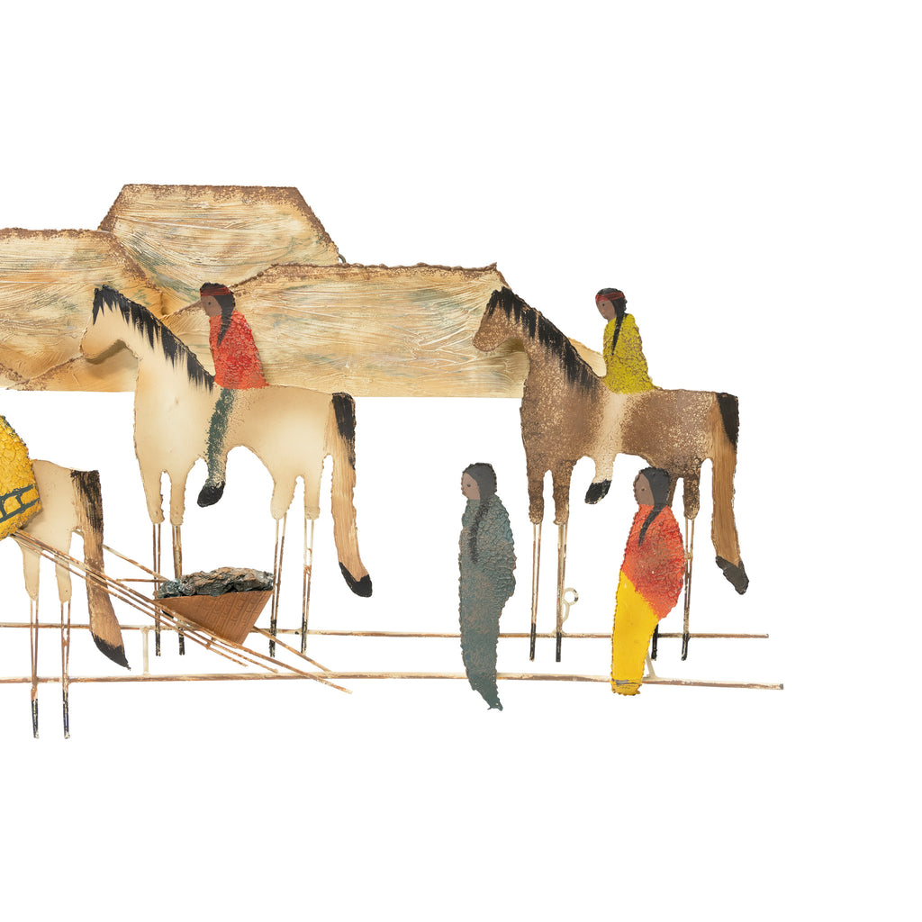 Native American figural polychrome metal wall sculpture of Indians moving camp. Signed at right "C. Jere (Curtis) Jere, Artisan House Curtis Freiler Circa 1910-2013, Jerry Falls, 1917, 2007" dated 1993. Matching mirror, Item AF0627.