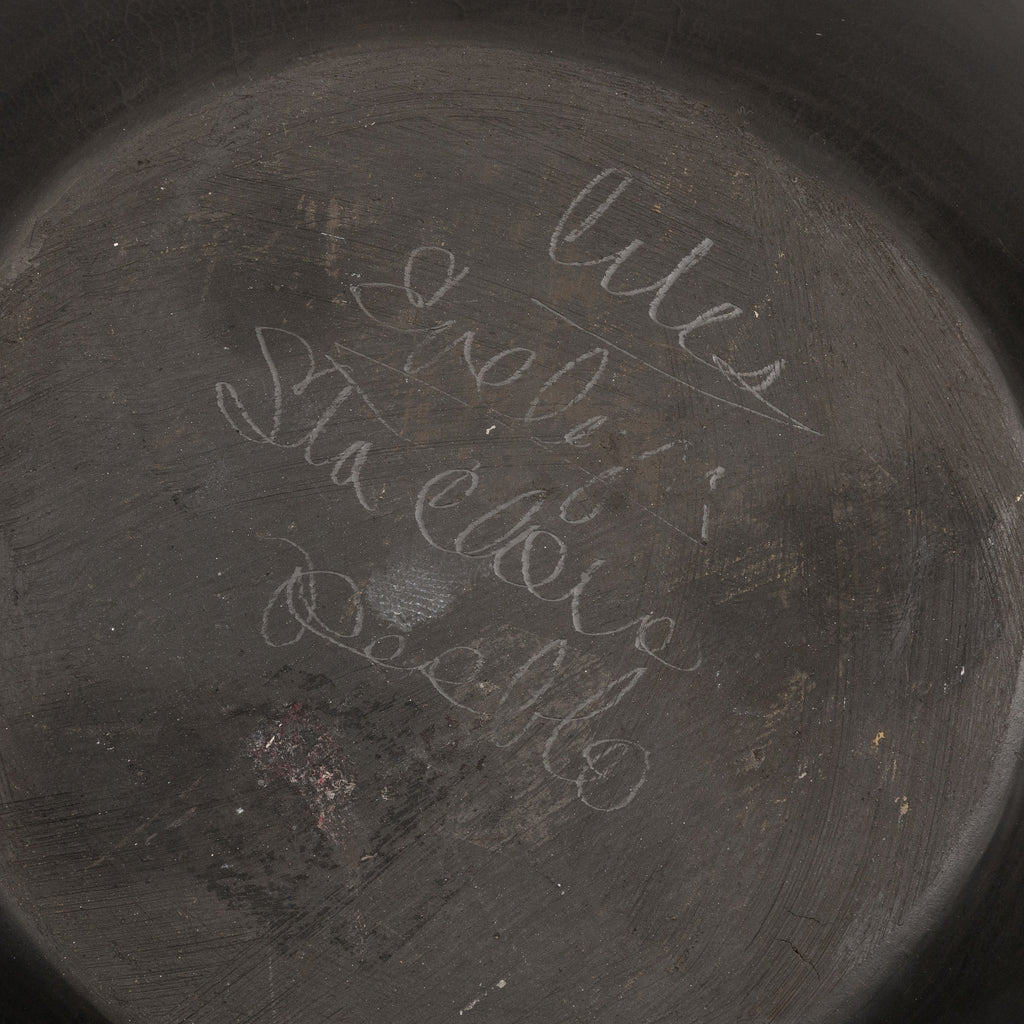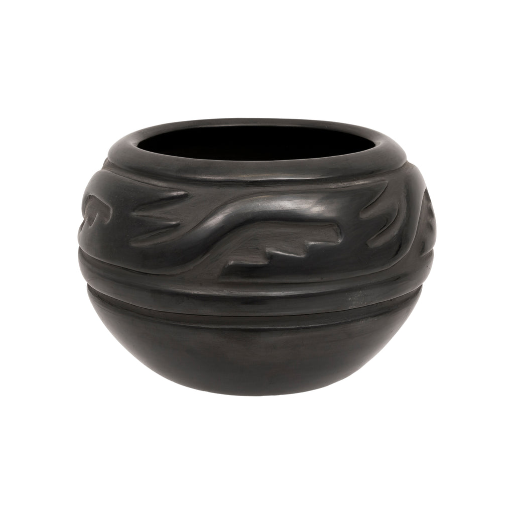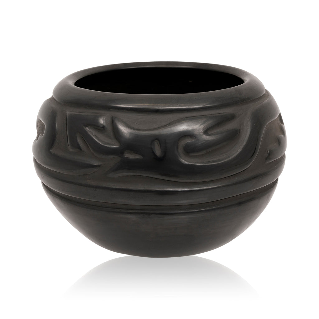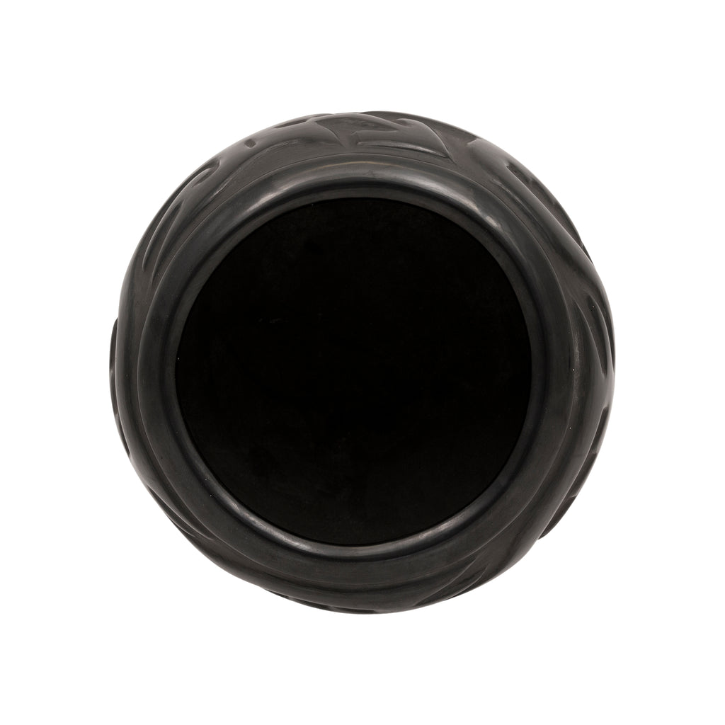 Black on black pottery jar heavily carved with serpentine anjou around body, signed Evelyn Aguilar. 5" x 7".