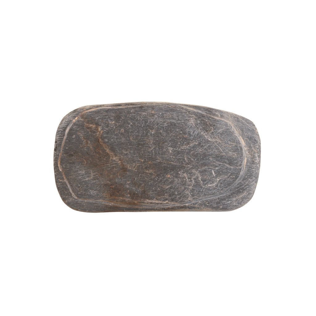 The basic rectangular form has been ovalized by grinding. A crude incised line defines the border on either side indicating dual sided utilization. The material is schist and both mixing surfaces are flat. No attempt to raise or decorate the borders was made. Palettes of this type first appeared in the Snaketown Phase, evolving from sandstone and crystalline rock, and continued through the end of the Sacaton Phase. This palette, with lack of definition, detail or care in manufacture, represents the degenerative type produced late in the period. By the following Classic Period palettes had largely passed from the culture complex. This item is guaranteed to be of the time period and condition as described, has been exported legally and is legal to buy and sell under all international laws relating to cultural patrimony.