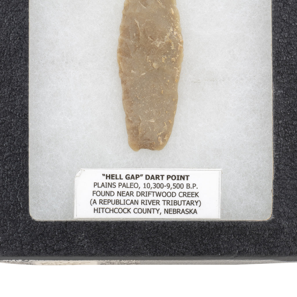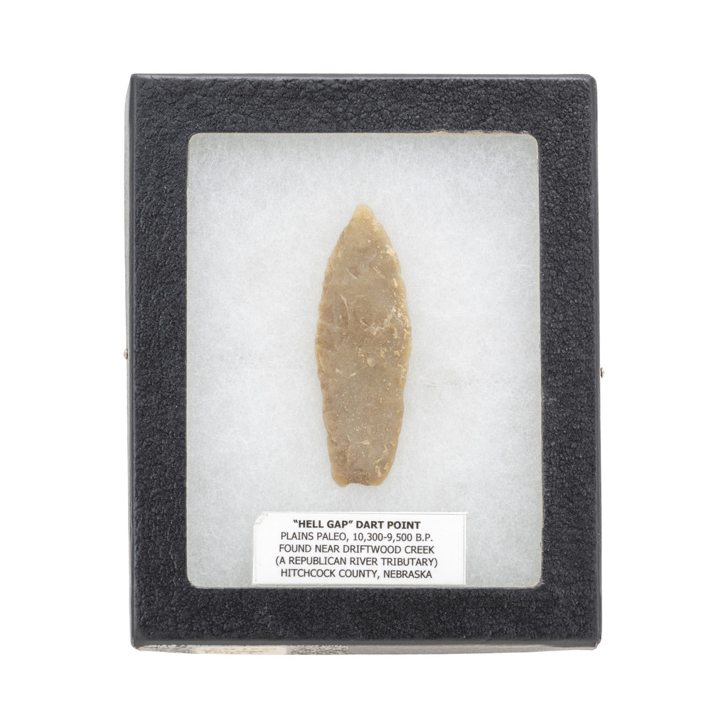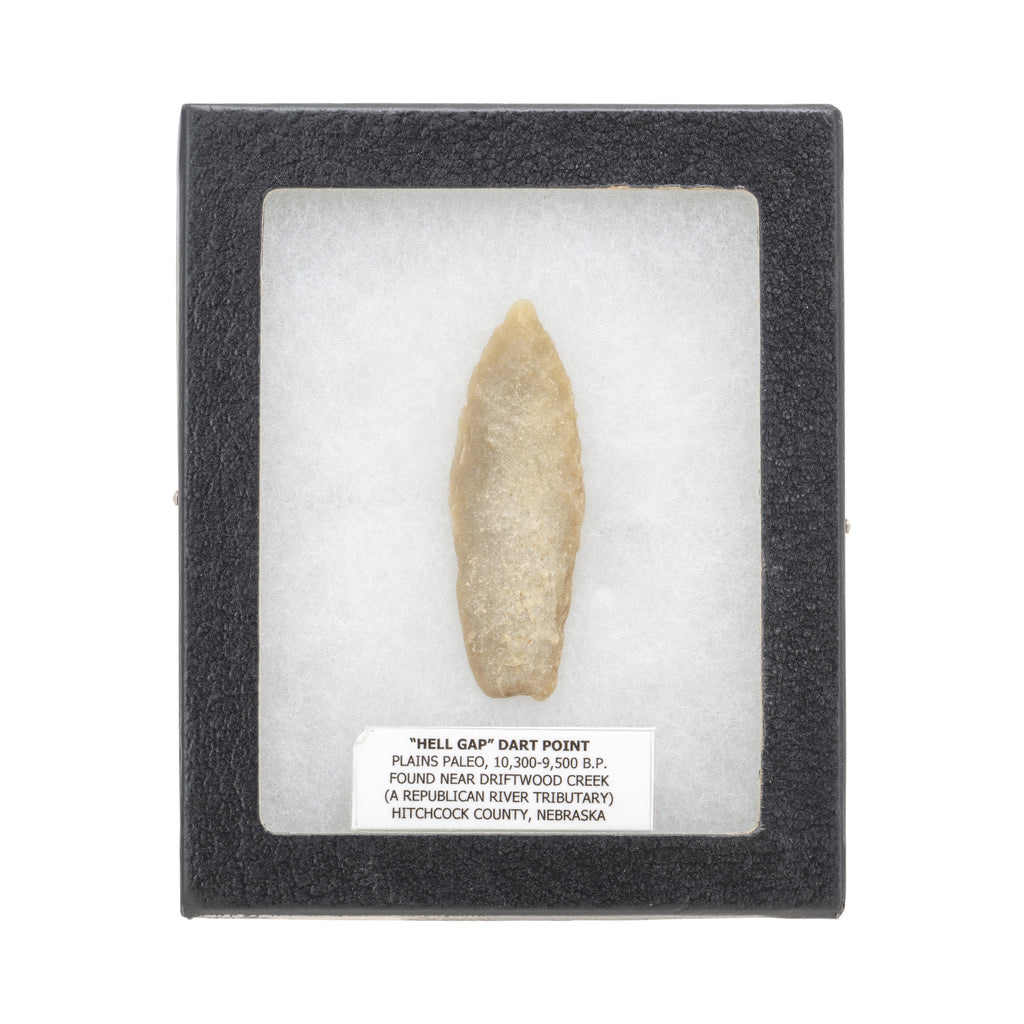 Plains Paleo Hell Gap Point. Plains Paleo Hell Gap Point, Hitchcock Co. Nebraska. This 2 5/8"L, edge translucent tan chalcedony Paleo-Indian dart point, typed as Hell Gap dating circa 10,300 - 9500 BP, was found near Driftwood Creek, a tributary of the Republican River in Hitchcock County, Nebraska. Overall good condition with a few small usage nicks along its forward edges and a small ding on one basal corner. With an excellent patina on the surface that was obviously exposed to the sun, this point comes in a 4" x 5" glass fronted collector frame along with authenticity and a map of Nebraska highlighting the general area in which it was found. Ex. Calvin Howard Collection. Ex. Hank Johnson Collection. Hank Johnson was a geologist, and passionate collector of historical and ancient artifacts. Starting with relics and bottles from ghost towns, he later focused on Anasazi pottery and Pre-Columbian. He worked with the Denver Art Museum to verify authenticity, building a respected reputation in the collecting community. View the entire Hank Johnson Collection under Special Collections “Johnson.”