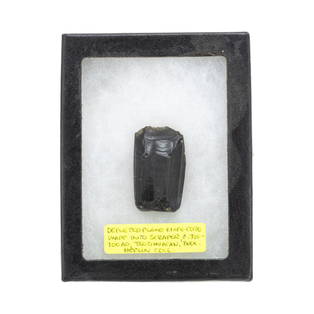 Prehistoric Core Scraper. Depleted flake knife/core made into scraper. Circa 300 - 700 AD. Teotihuacan, Mexico. 1 3/8", 3" x 4" Riker frame. Ex. Heflin Collection. Ex. Dr. Heflin Collection. Dr. Allen Heflin was a past president of the KC Chapter of the Missouri Archeological Society. Dr. Heflin worked as a specialist veterinarian with the USDA for over four decades. During his 14 years of service in Mexico in the 1940s-1960s, Dr. Heflin pursued his archeological interests and published several articles in Mexican anthropological journals. His large estate consisted of over 8,000 pieces collected from all areas of the world. 70% of the items are from Pre-Columbian cultures of Central America. Ex. Hank Johnson Collection. Hank Johnson was a geologist, and passionate collector of historical and ancient artifacts. Starting with relics and bottles from ghost towns, he later focused on Anasazi pottery and Pre-Columbian. He worked with the Denver Art Museum to verify authenticity, building a respected reputation in the collecting community. View the entire Hank Johnson Collection under Special Collections “Johnson.”