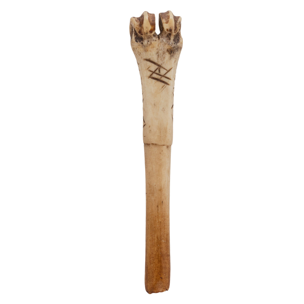 Heavily carved and patinated 18th Century wing bone scoop. Worn edges and tip. Assume used for powder. Native or mountain man made. A much used piece with high polish. 5"L