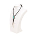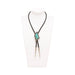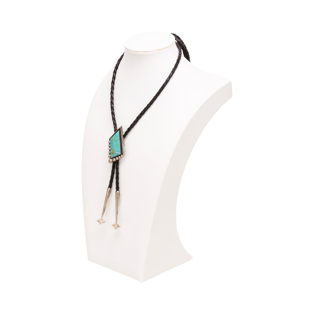 Trapezoidal bolo with line frame, beaded balls and trapezoid form with carved stone. Stamped "Sterling" on back.