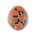 Sterling and coral old pawn ring. Oxblood coral in shadow box design, surrounded by sterling beads. Set in thick sterling bands.