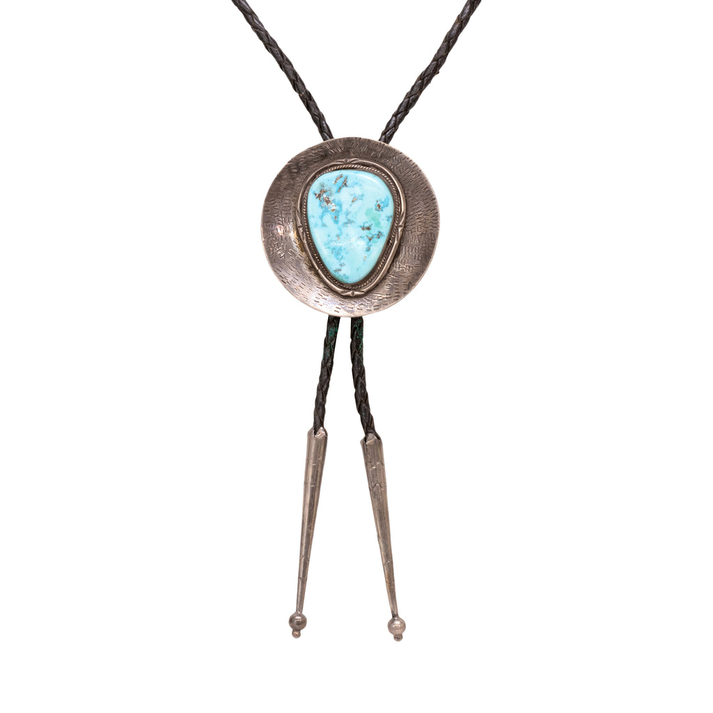 Navajo hand stamped bolo with double border and exceptional kingman nugget.