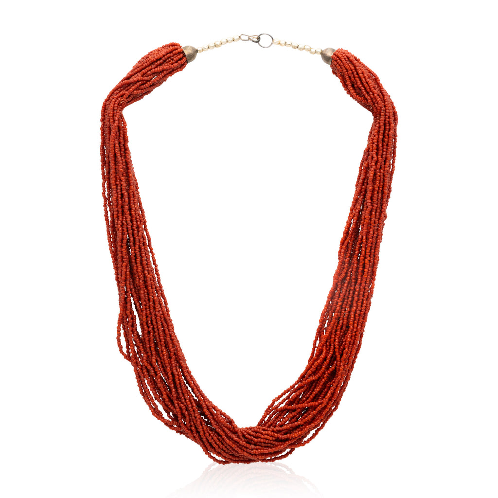 Native blood red coral beaded 30 strand necklace with sterling silver beaded hook and eye clasp. Strung with seed beads and grade A natural coral. 30"L