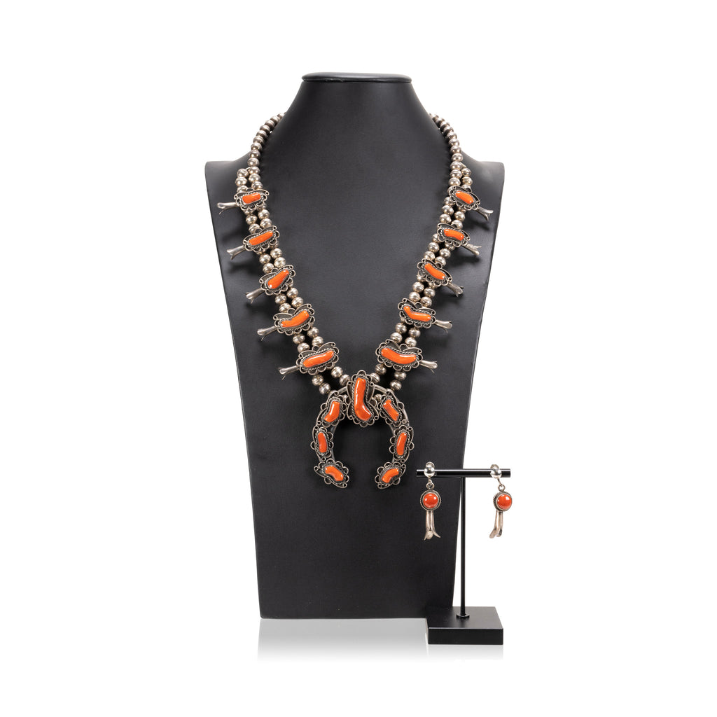 Old Pawn with high grade coral. Native coral and sterling silver squash blossom necklace featuring a classic naja with seven beautiful coral cabochons accented by twisted rope and light hand stamped designs. The petal blossoms along the neck feature more exceptional, high-grade coral with the same accents. Strung on coated wire. 25"L plus 3" naja, 3 1/4"W at the widest part.
