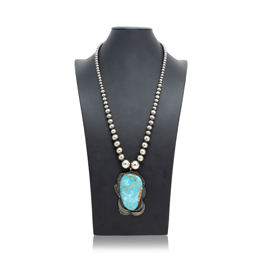 Sterling silver and Blue Diamond turquoise necklace. Graduated sterling silver pearl chain ending with large turquoise slab set in shadow box with leaf design. Lots of patina that shows age. Great untreated, natural stone with nice depth. Old Pawn.