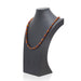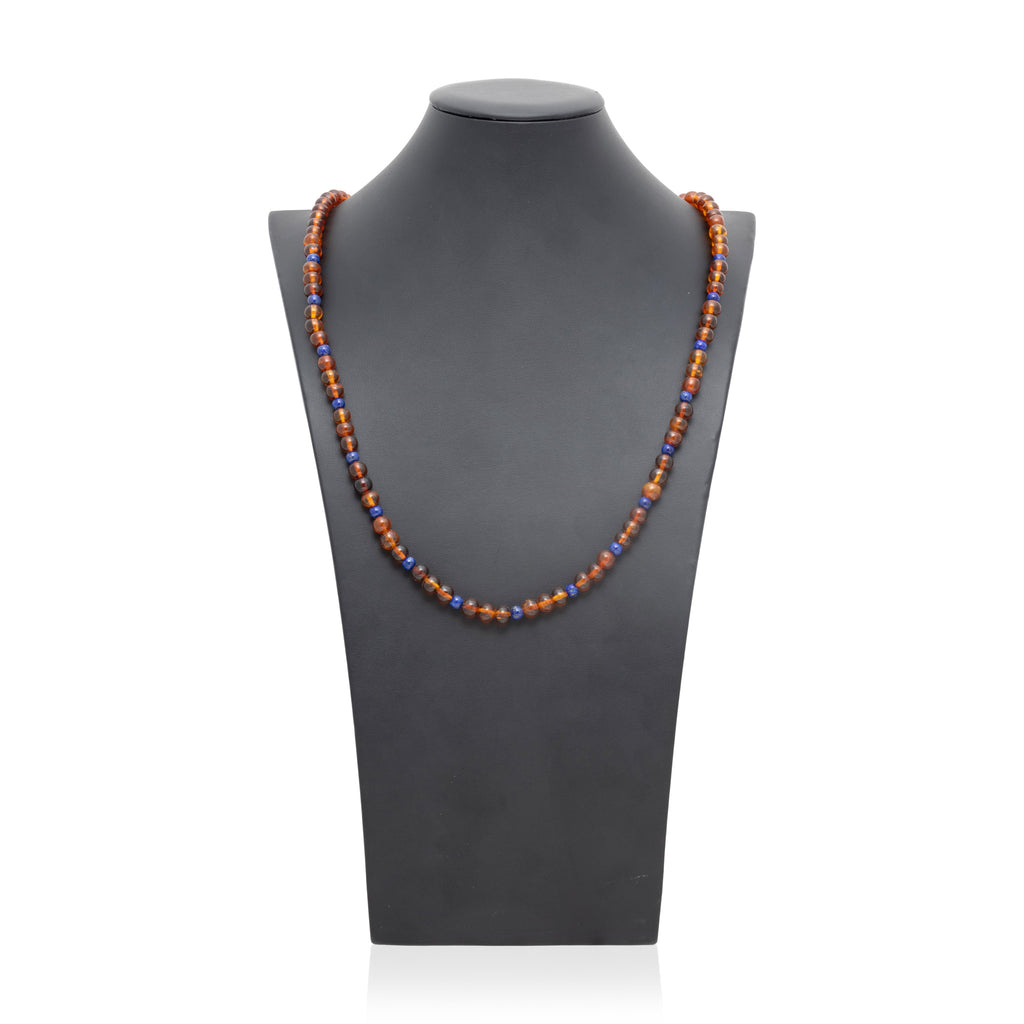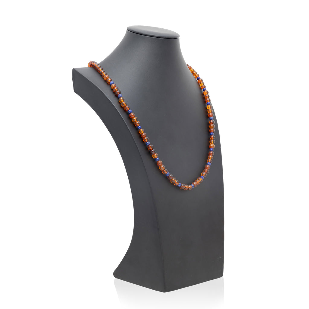 Navajo amber and lapis beaded necklace. Even round beaded balls of amber interspersed with smaller beaded balls of genuine dark blue lapis. Sterling silver beaded and eye clasp closure with hand stamped palmettes and maker's mark. 34"L