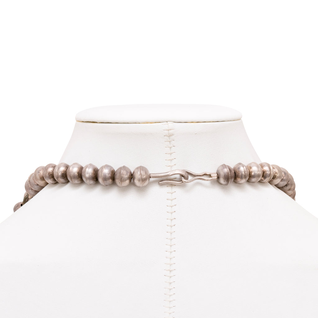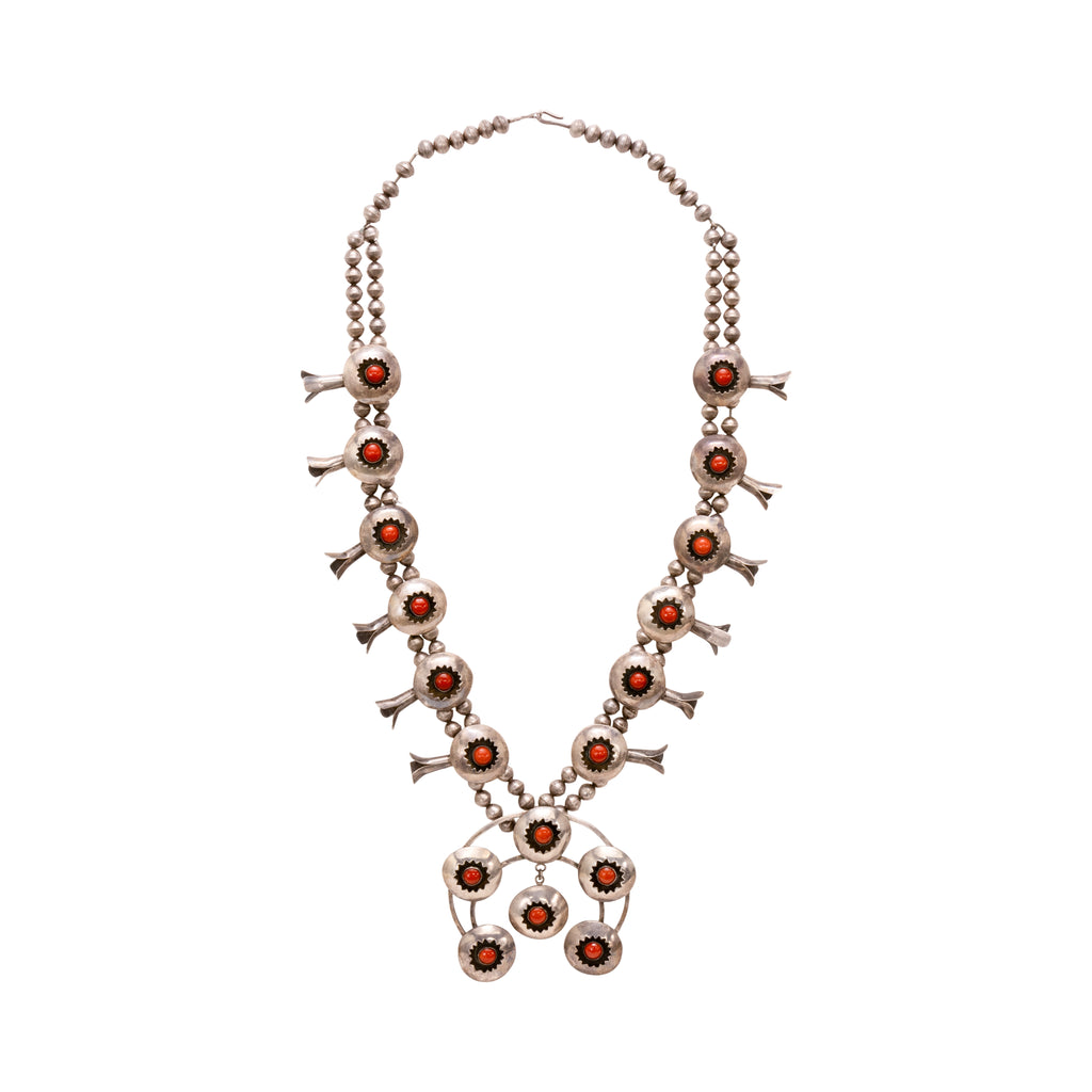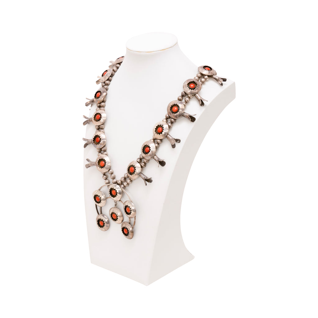 Navajo coral and sterling silver squash blossom necklace. 12 petals with grade A quality, natural and untreated red coral in shadowbox circles on double sterling beaded chain ending in matching naja with additional five stones. No makers mark, traditional of the time period. Acquired from a family whose mother purchased directly on the reservation. 28"L plus 3" naja