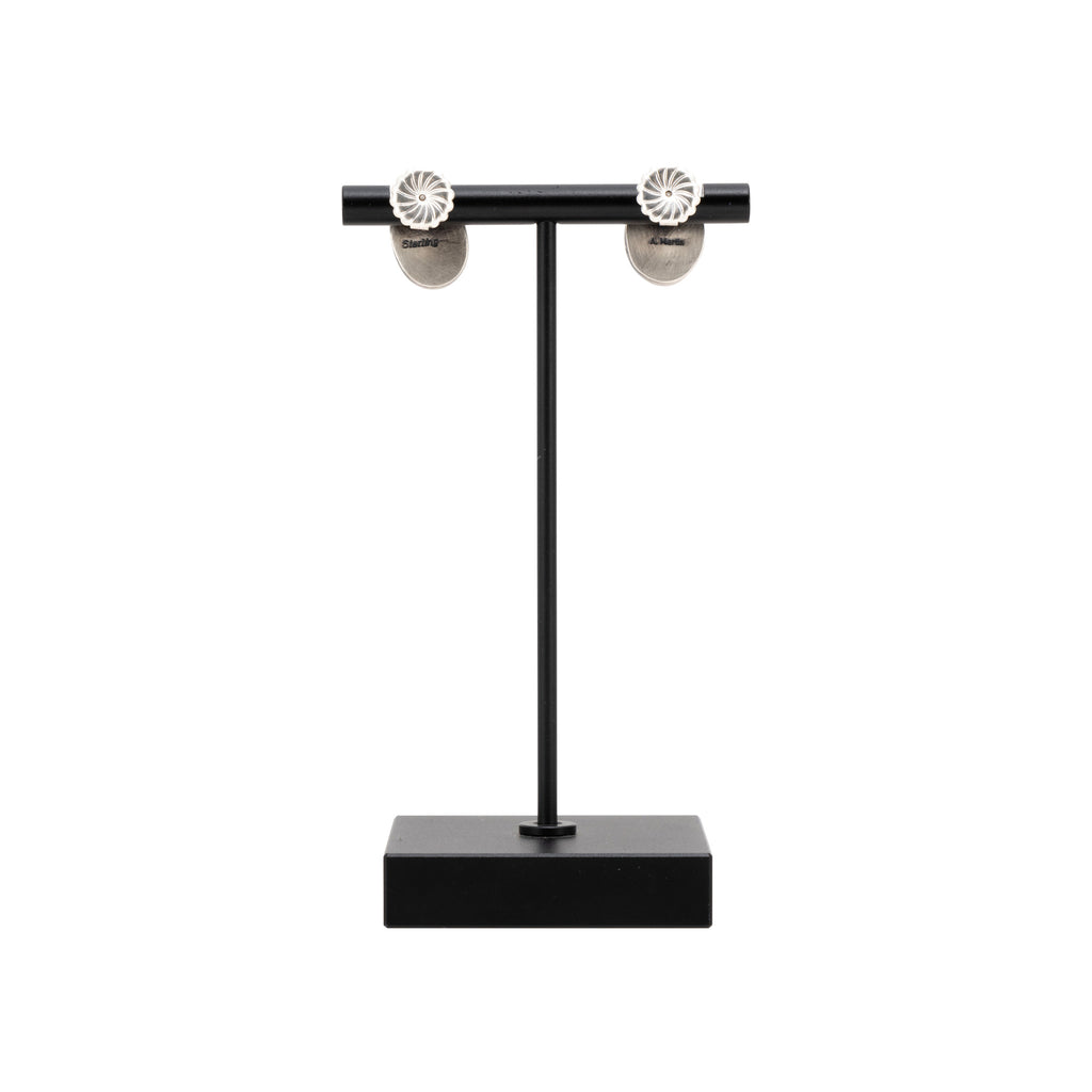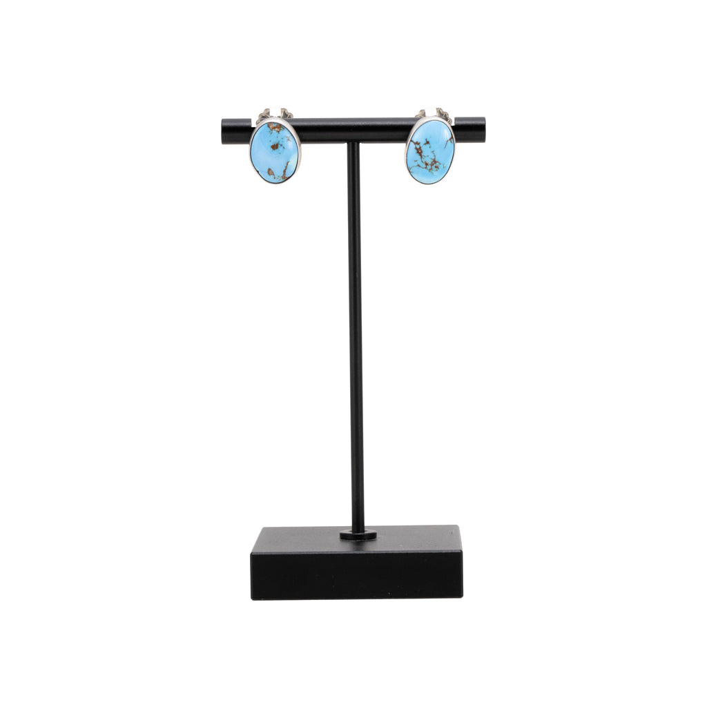 Navajo Golden Hill turquoise and sterling silver stud earrings in an oval shape. Single grade A quality, natural untreated stone with great depth on sterling post. Made by Navajo silversmith Angela Martin. Stamped sterling with maker's hallmark. Desert Lavender, or Golden Hill Turquoise is one of the most distinct-looking turquoise pieces out in the turquoise market. Although it has only been introduced in the US around 2018, its undeniable beauty truly stands out! Its light baby blue appearance coupled with light brown to brown, to ‘lavender’ matrixes are quite distinguishable and definitely scene-stealing!