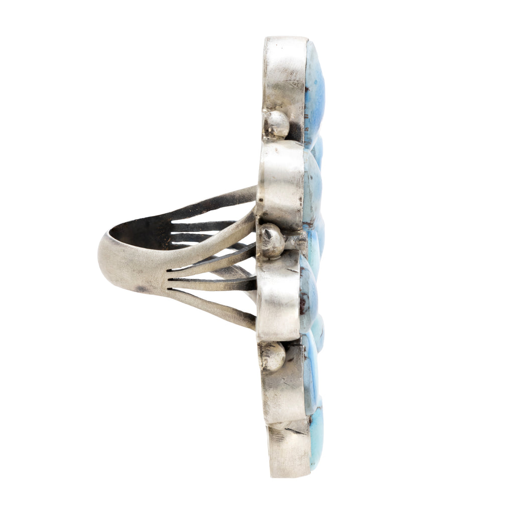 Navajo Golden Hill Turquoise and sterling silver ring. Nine exceptional stones set in shadow box frame with sterling silver beads. Stamped "sterling" with maker's name "Shiela" on inside.
