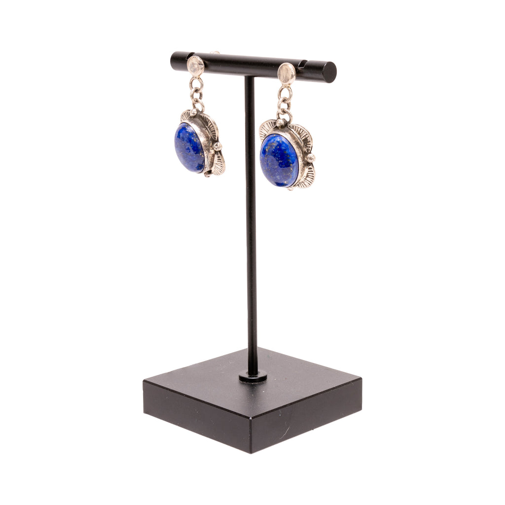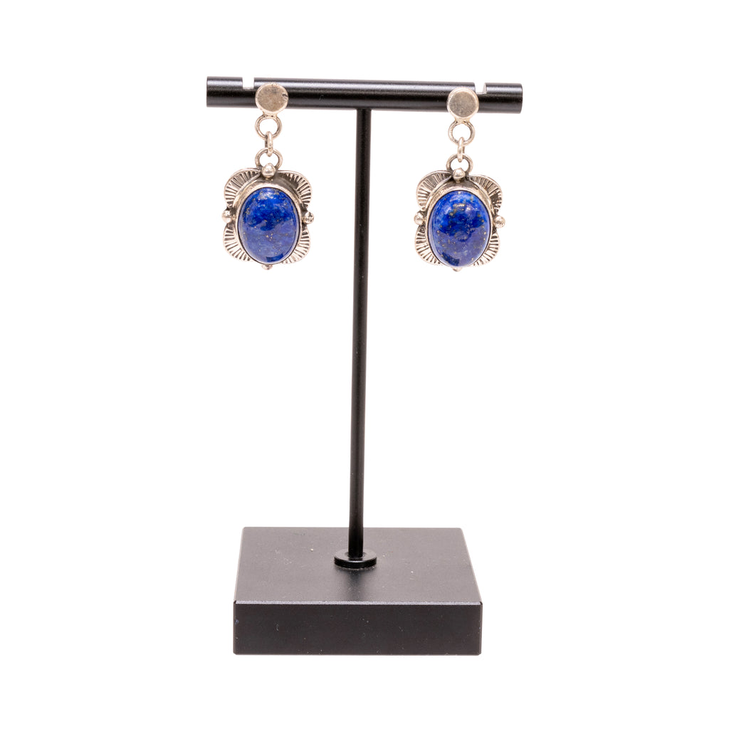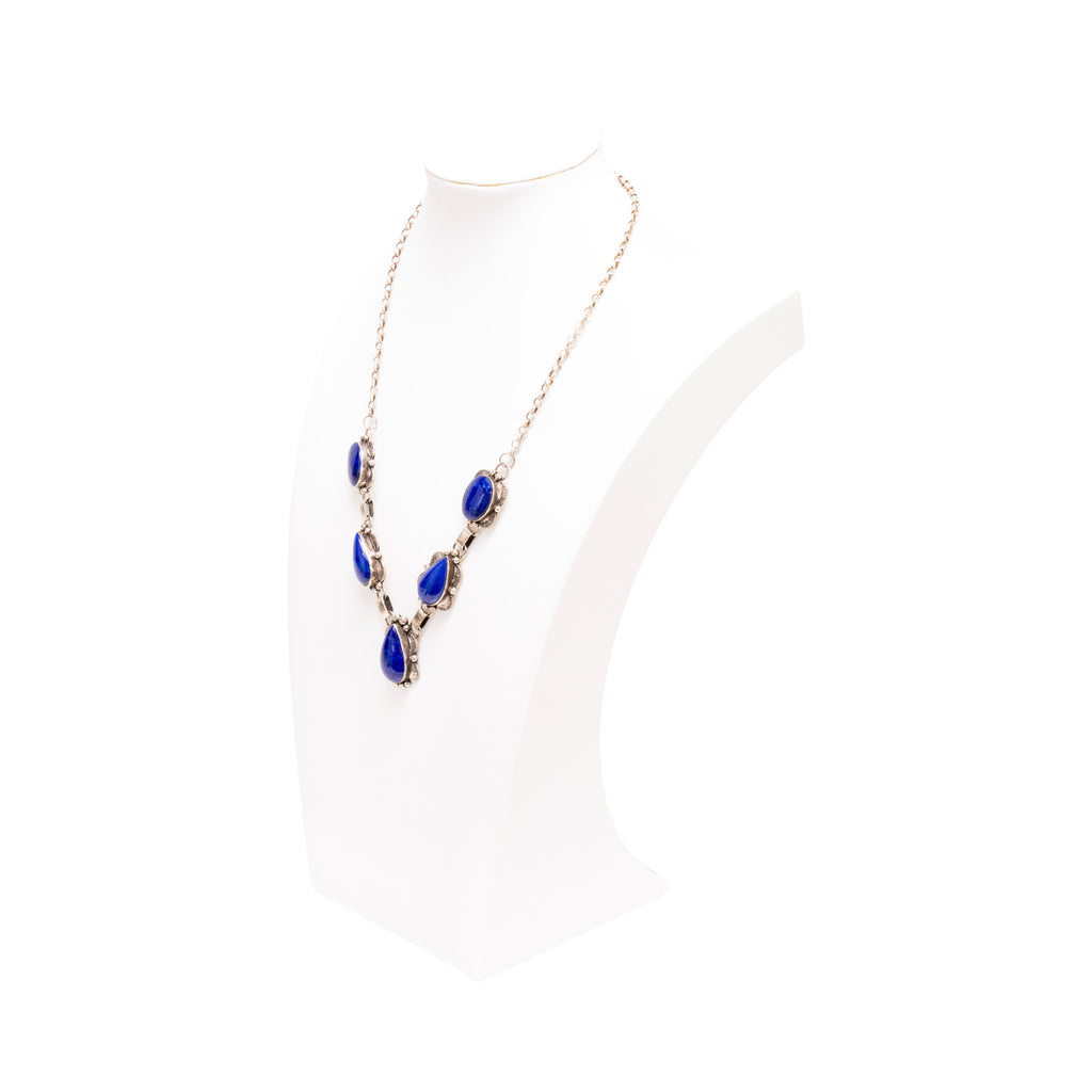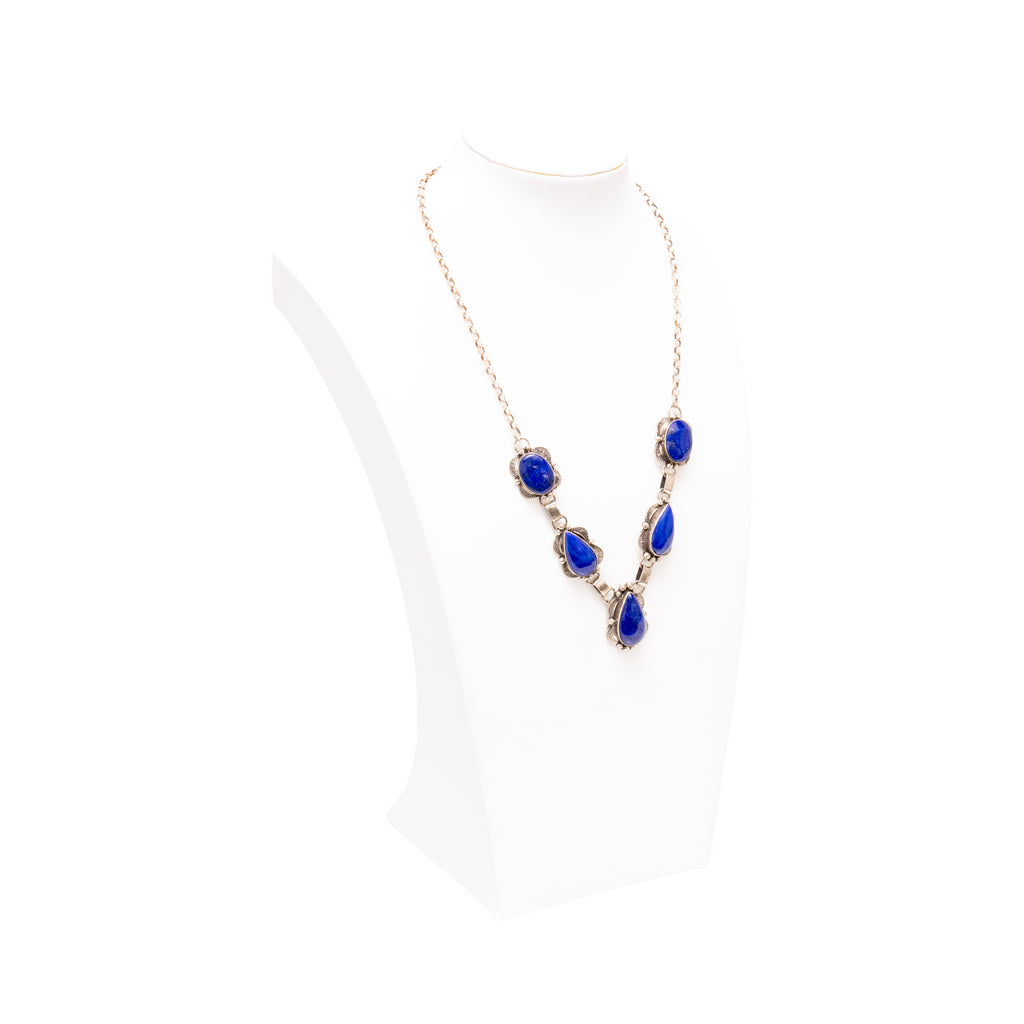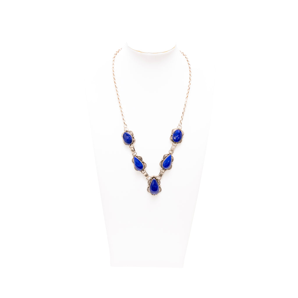 Navajo lapis and silver necklace and earrings set. Lapis is a dark, rich blue, with each stone being set in scallop and sterlig bead border. Necklace having 5 stones total. Marked sterling silver. Maker marked M. Spencer.