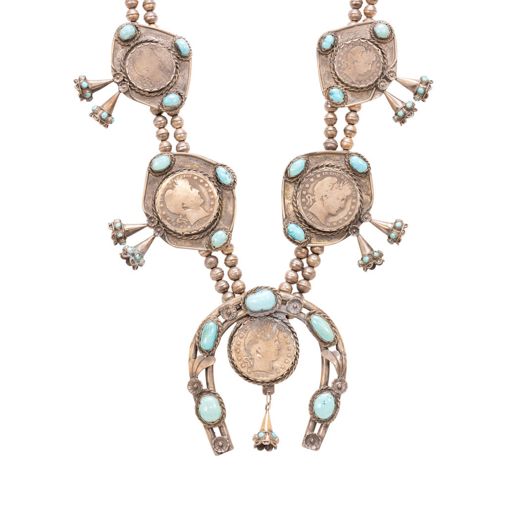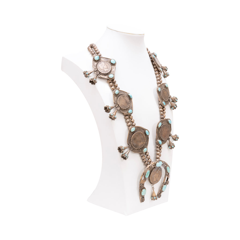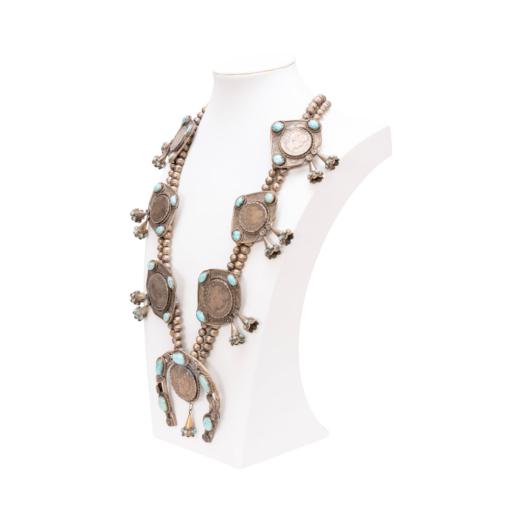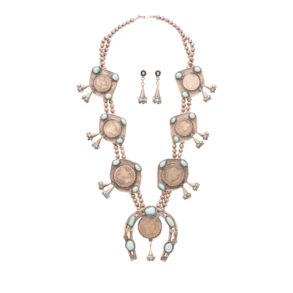 Navajo squash blossom and earring set. Beaded blossoms with three silver dollars dated 1894, 1902, and 1906; and four silver half dollars dated 1898, 1892, 1899 and 1911. The turquoise is from the Sleeping Beauty Mine in Arizona. Necklace and matching earrings. Old Pawn. Acquired from a Navajo trader. The Navajo word for the squash blossom bead literally means “bead that spreads out”. This tri-petal form first appeared about 1880. Scholars believe that this flower motif was introduced by the Spanish as a variation of the pomegranate flower blossom, and the Navajo adapted it as a symbol of their revered squash. Initially the necklaces were rather simple with the tri-petal silver beads interspersed with rather plain beads. In time, stones were added to the blossom beads as demonstrated in our collection. According to the Navajo, the Naja is strictly decorative; however, it has always been held in high regard by the Navajo and other peoples.