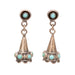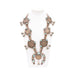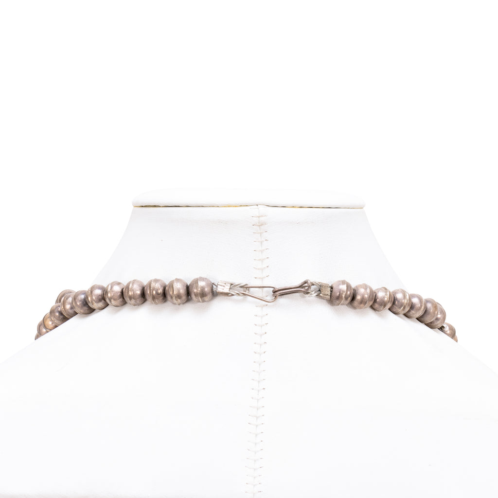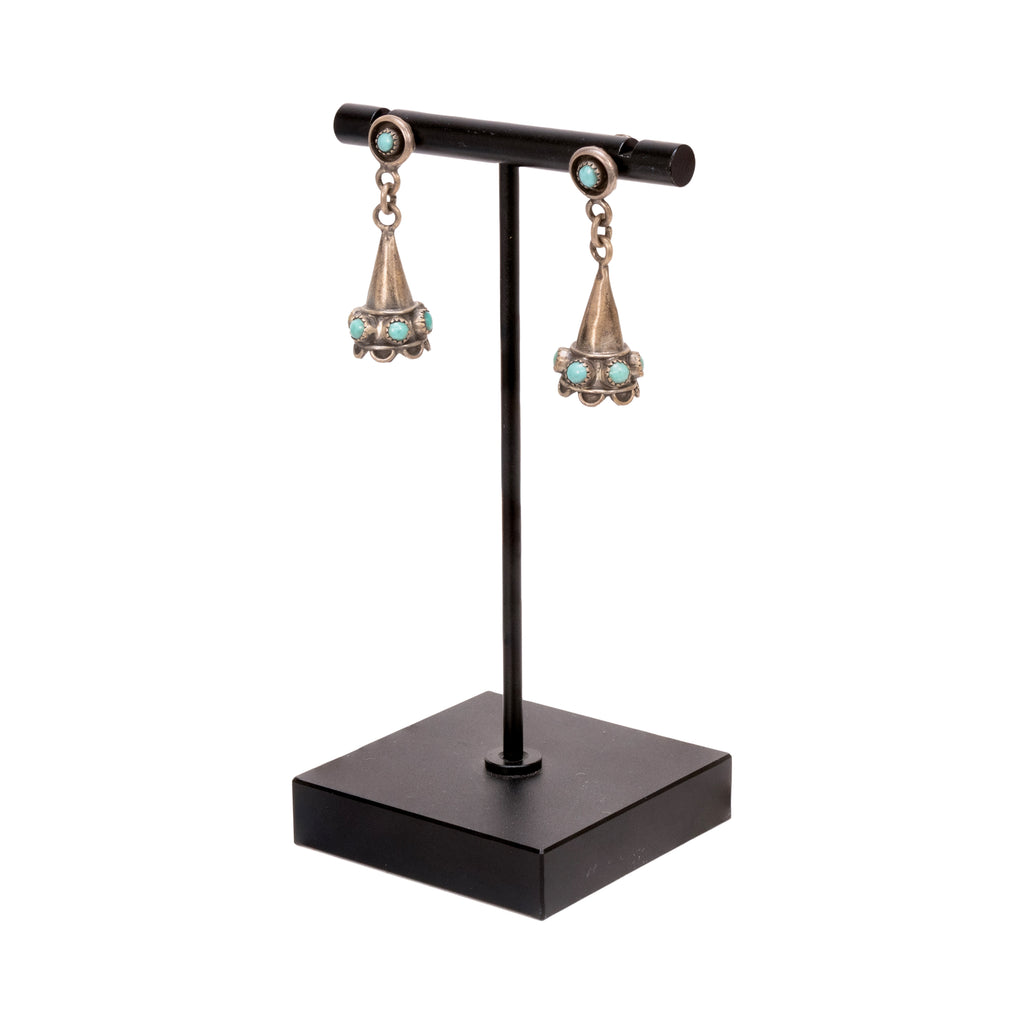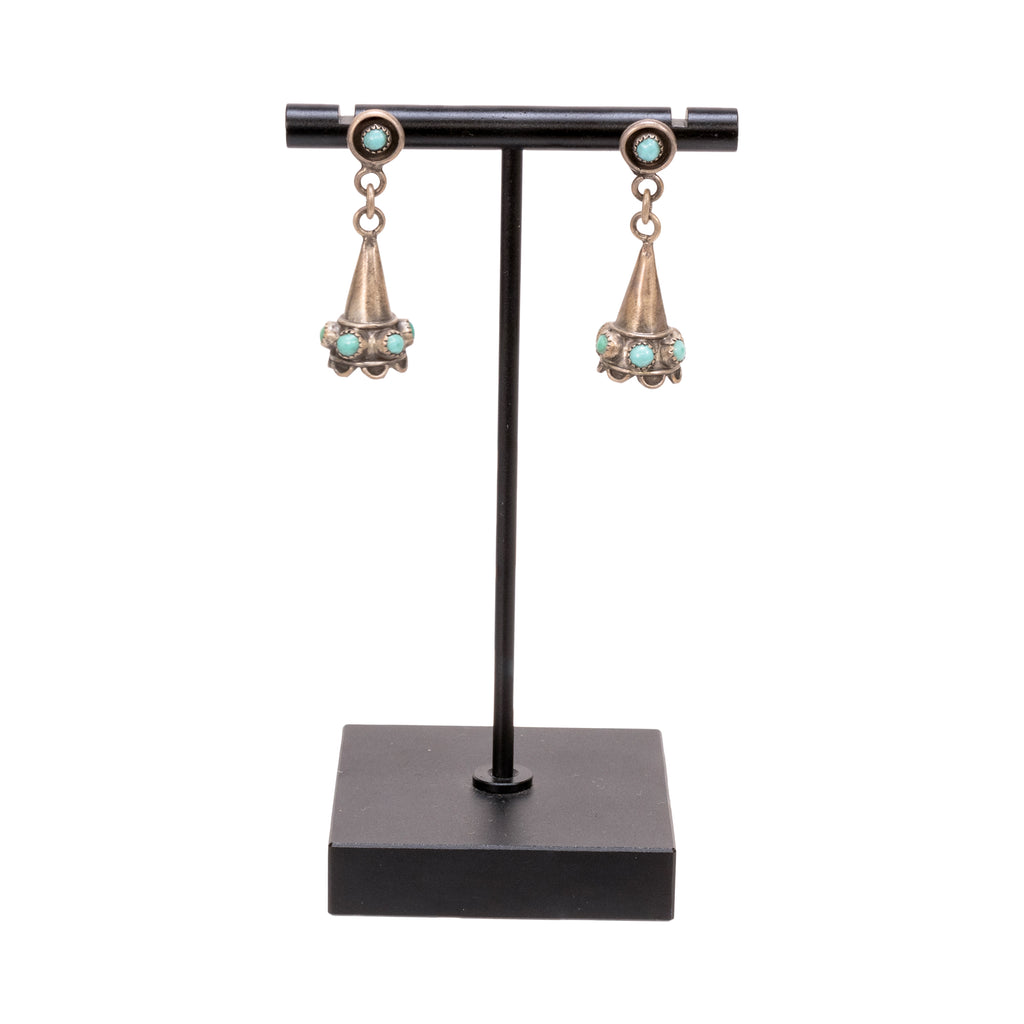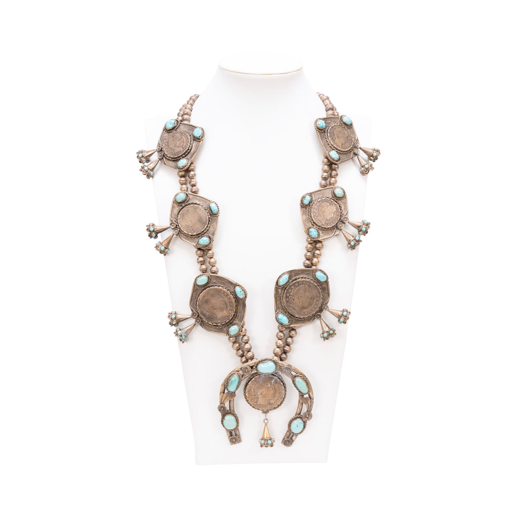 Navajo squash blossom and earring set. Beaded blossoms with three silver dollars dated 1894, 1902, and 1906; and four silver half dollars dated 1898, 1892, 1899 and 1911. The turquoise is from the Sleeping Beauty Mine in Arizona. Necklace and matching earrings. Old Pawn. Acquired from a Navajo trader. The Navajo word for the squash blossom bead literally means “bead that spreads out”. This tri-petal form first appeared about 1880. Scholars believe that this flower motif was introduced by the Spanish as a variation of the pomegranate flower blossom, and the Navajo adapted it as a symbol of their revered squash. Initially the necklaces were rather simple with the tri-petal silver beads interspersed with rather plain beads. In time, stones were added to the blossom beads as demonstrated in our collection. According to the Navajo, the Naja is strictly decorative; however, it has always been held in high regard by the Navajo and other peoples.