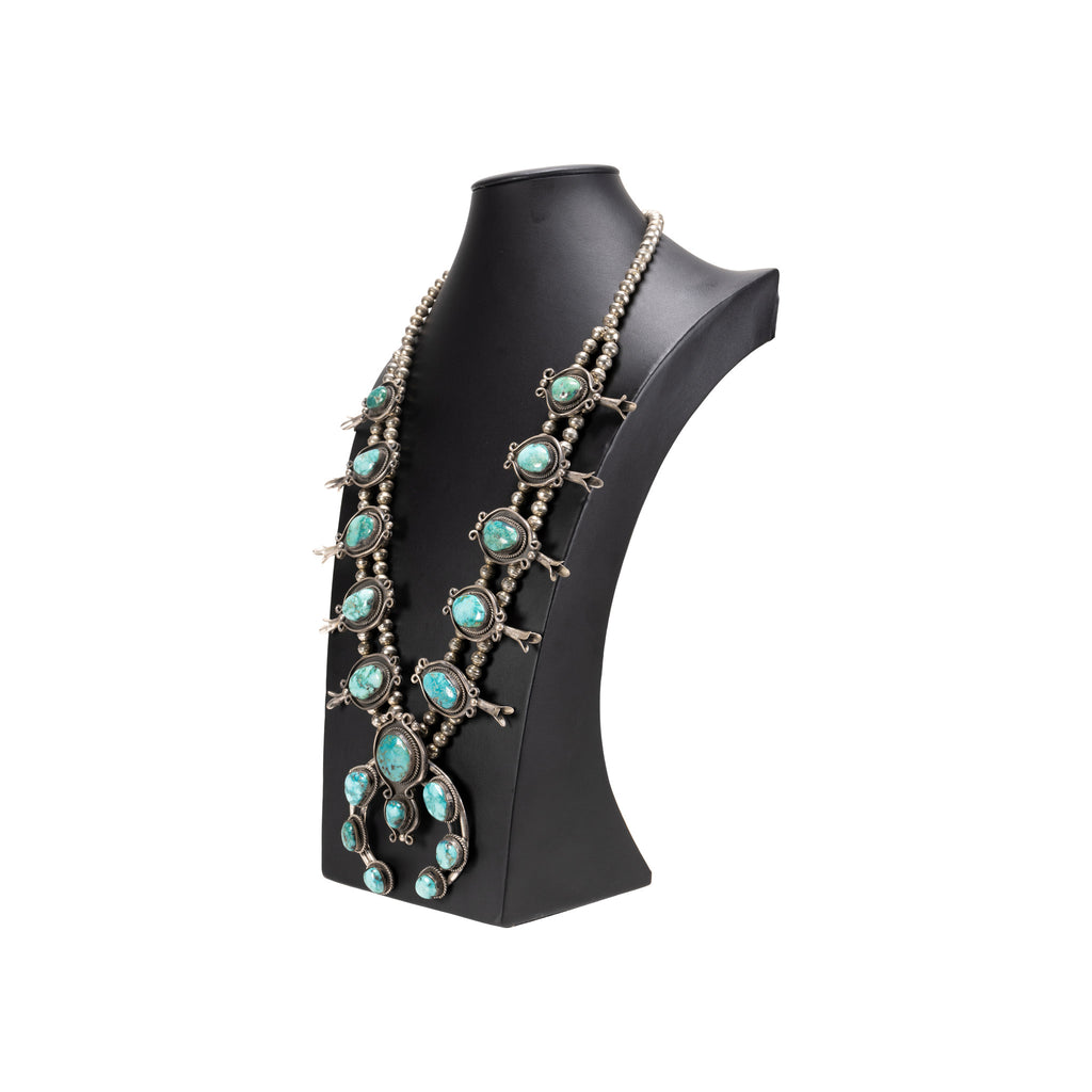Navajo squash blossom necklace. The turquoise is from the Kingman Mine in Arizona. Eighteen turquoise stones total. Old Pawn. From the Indian Store in Clovis, New Mexico. The Navajo word for the squash blossom bead literally means “bead that spreads out”. This tri-petal form first appeared about 1880. Scholars believe that this flower motif was introduced by the Spanish as a variation of the pomegranate flower blossom, and the Navajo adapted it as a symbol of their revered squash. Initially the necklaces were rather simple with the tri-petal silver beads interspersed with rather plain beads. In time, stones were added to the blossom beads as demonstrated in our collection. According to the Navajo, the Naja is strictly decorative; however, it has always been held in high regard by the Navajo and other peoples.