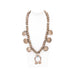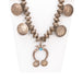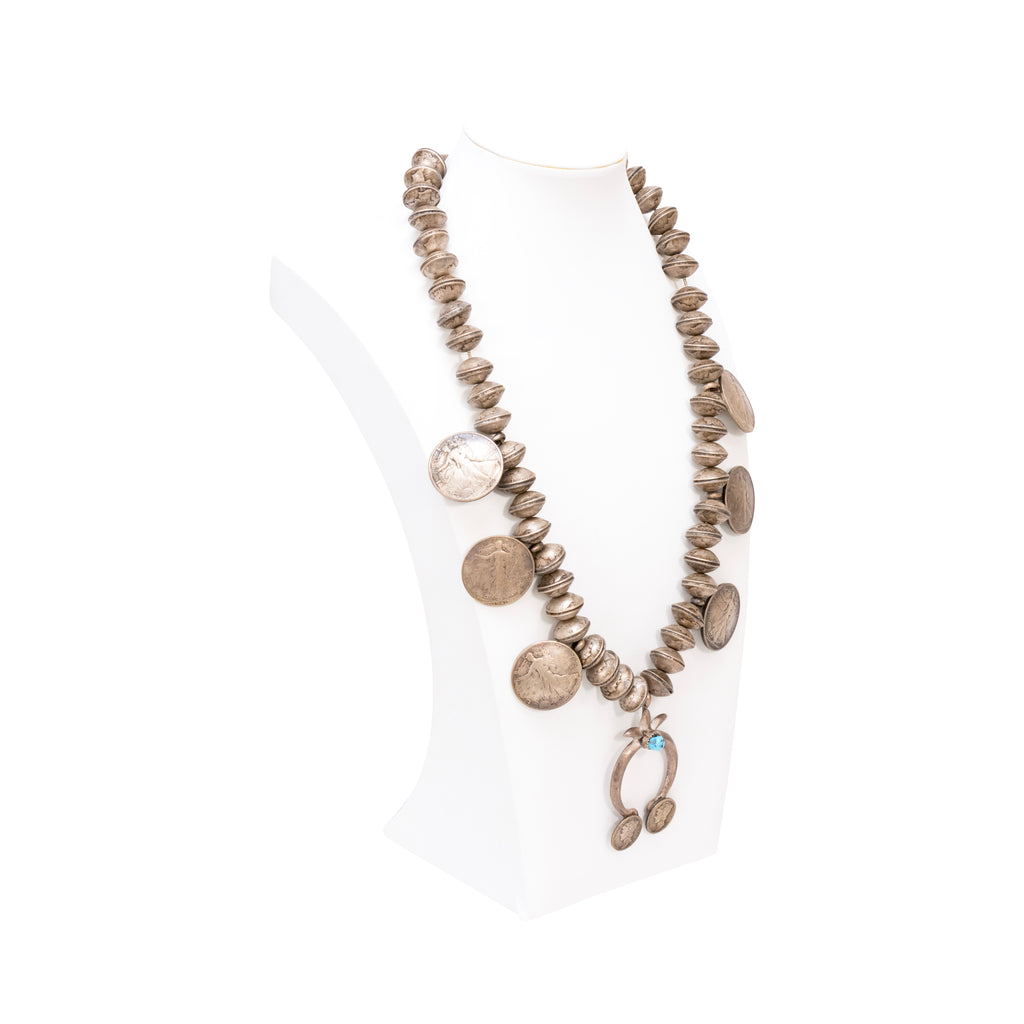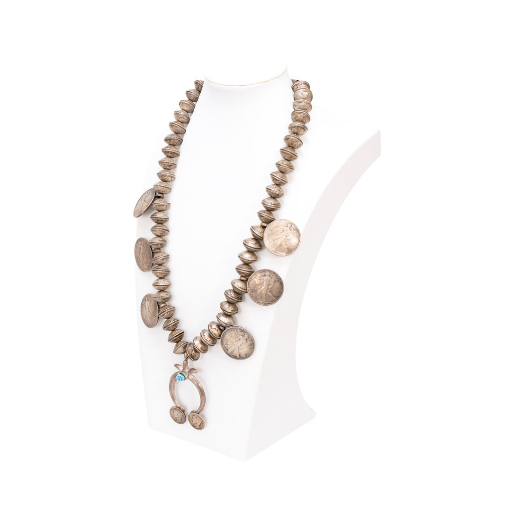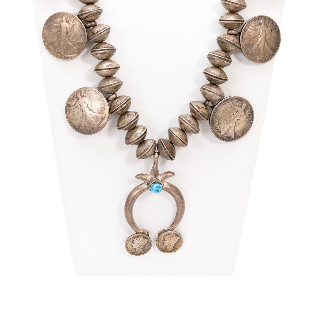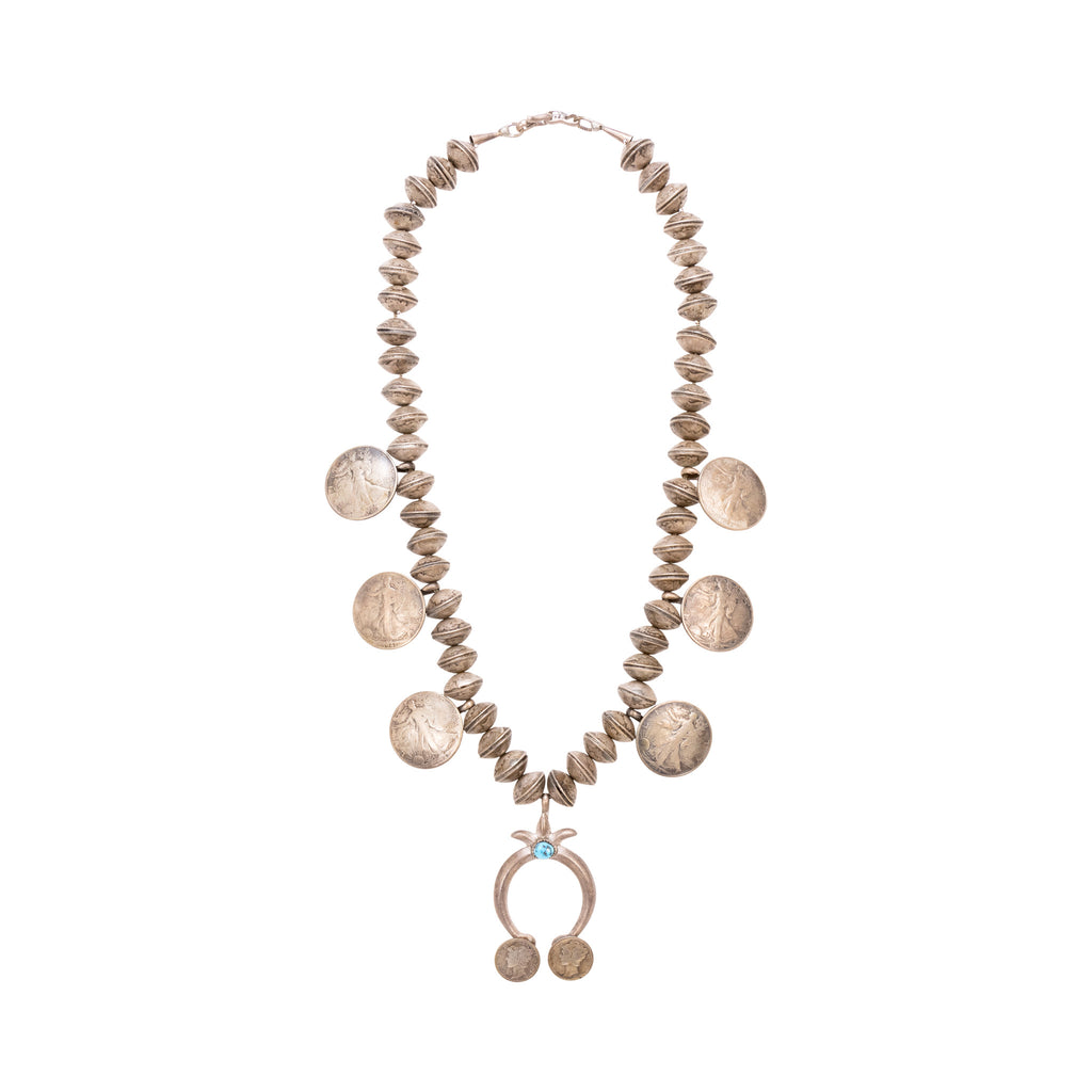 Navajo sterling silver and squash blossom. Each bead is a coin hand stamped together. Center Kingman turquoise stone in naja. Four Liberty 1945 coins and two smaller ones on naja. Old Pawn. Acquired from a Navajo trader. The Navajo word for the squash blossom bead literally means “bead that spreads out”. This tri-petal form first appeared about 1880. Scholars believe that this flower motif was introduced by the Spanish as a variation of the pomegranate flower blossom, and the Navajo adapted it as a symbol of their revered squash. Initially the necklaces were rather simple with the tri-petal silver beads interspersed with rather plain beads. In time, stones were added to the blossom beads as demonstrated in our collection. According to the Navajo, the Naja is strictly decorative; however, it has always been held in high regard by the Navajo and other peoples.