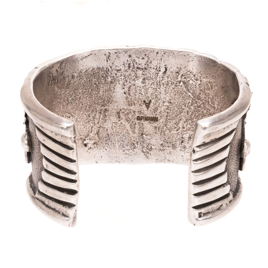 Blue diamond turquoise and coral bracelet on sturdy sterling silver cuff. Each stone framed by twisted rope border and leaf design etched into each coral stone. Stones are surrounded by leaf, scrolled, and sterling bead designs. Stamped on back "Navajo" and "A".