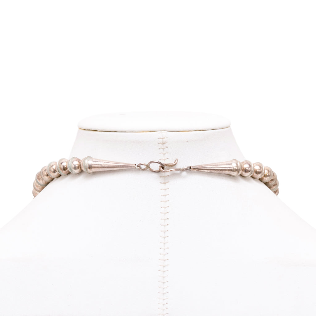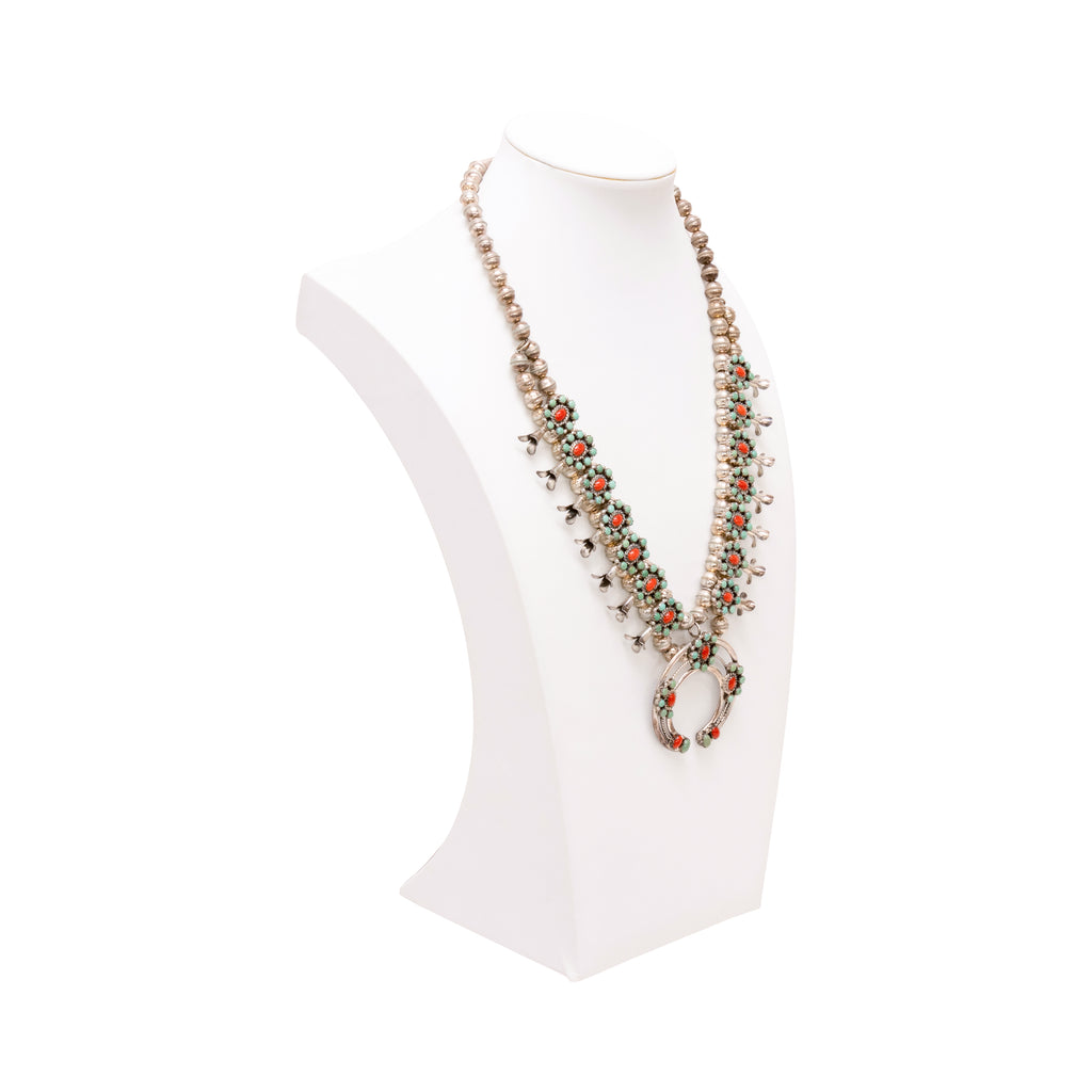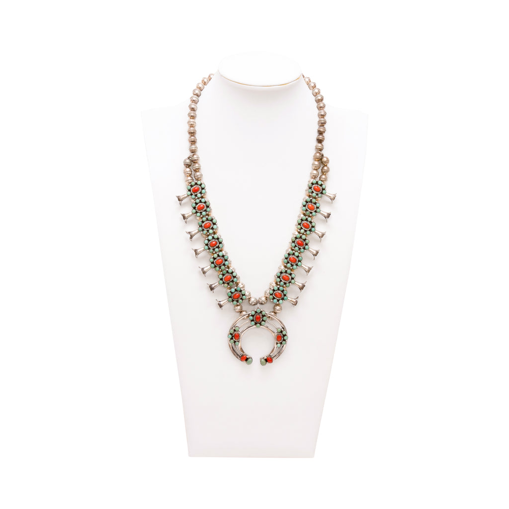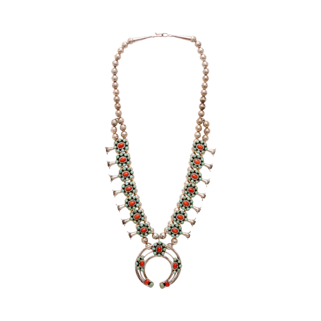 Navajo Kingman turquoise and coral squash blossom necklace. 14 floral petals consisting of eight natural untreated turquoise stones with one center coral stone on each petal ending in matching naja with additional three petals. Sterling silver double beaded chain. Petit and feminine, not as bulky and heavy as most. Marked "LFK" "Sterling." 20"L plus 2" naja