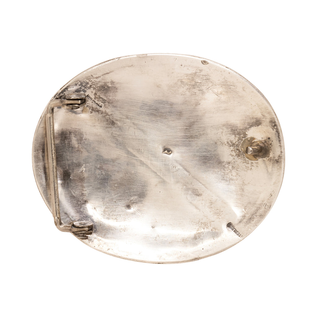 Navajo turquoise and sterling silver buckle. Featuring 23 Sleeping Beauty stones with stamped palmetta border and sterling bead details. Stamped with maker's buffalo mark on back. 3 1/4"W