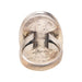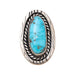 Single-stone Navajo turquoise and sterling silver ring. Kingman stone surrounded by twisted rope and stamped border. Solid and sturdy. Maker's mark on back, but illegible.