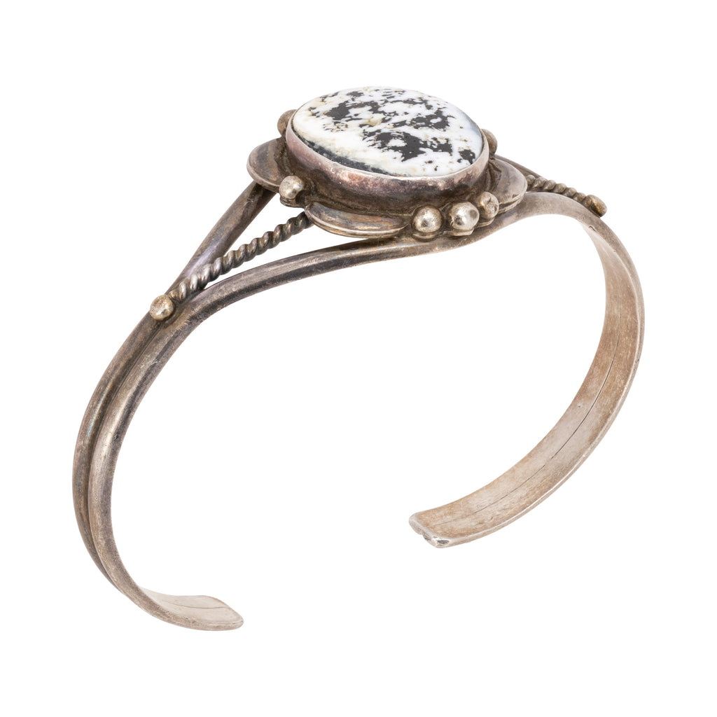 Navajo White Buffalo turquoise and sterling silver bracelet by Navajo Silversmith Mary Ann Spencer. Grade A quality stone set with sterling silver bands and twisted rope center. Maker's marked and stamped sterling. Great patina. Easily adjustable to fit wrist. 5 1/2" plus 1" opening, 22.10 grams.