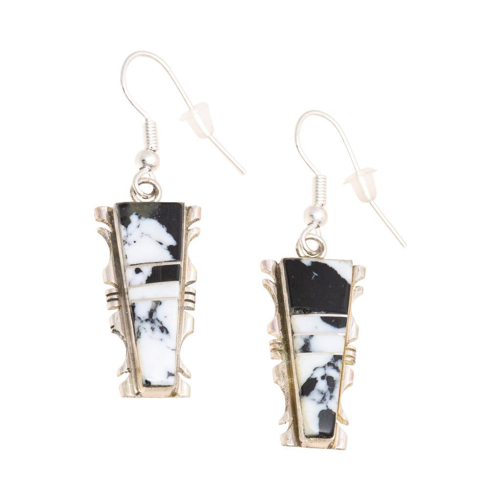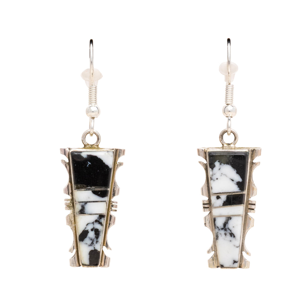 Navajo White Buffalo turquoise and sterling silver earrings by Navajo Silversmith Steve Francisco, Navajo. Maker's mark and stamped on back. Inlaid stones with interspersed sterling inlays. 1" drop, 2" total length, 5.64 grams.