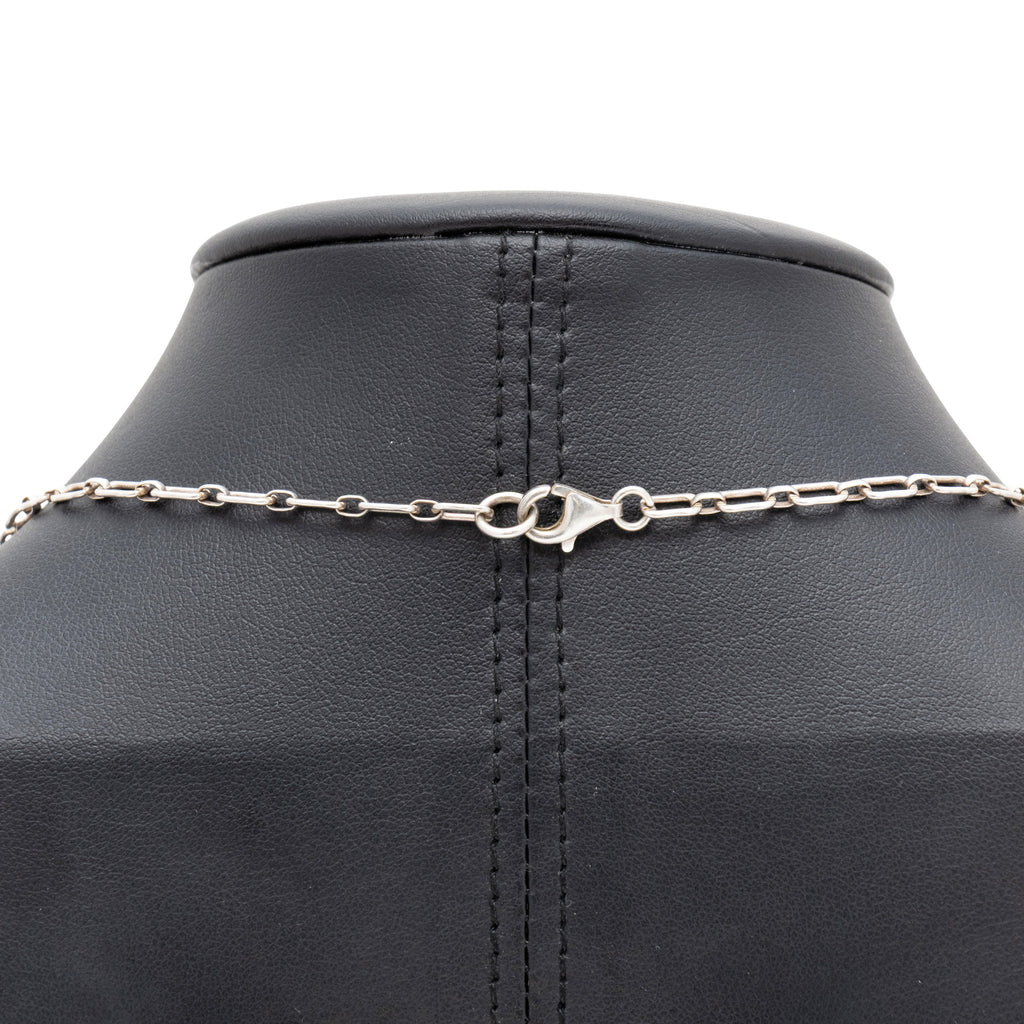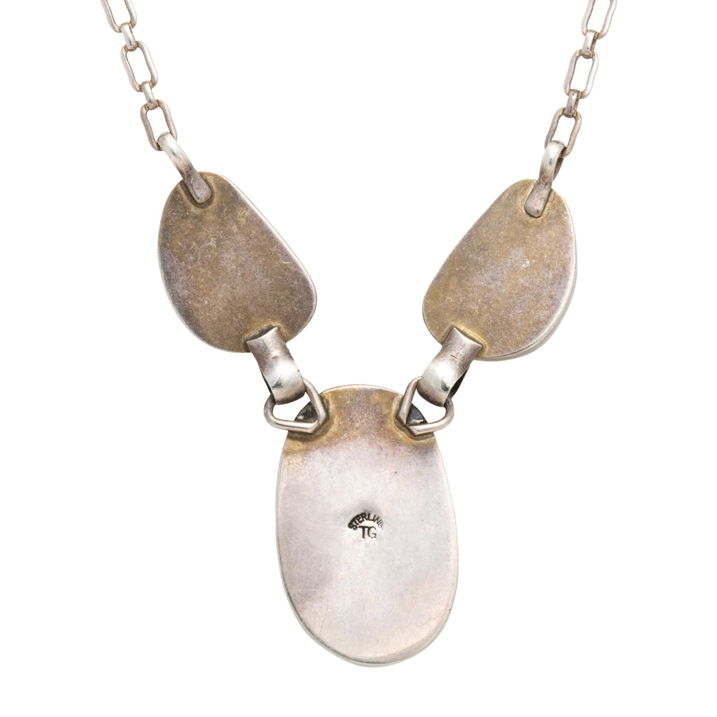 Navajo White Buffalo turquoise and sterling silver necklace by Navajo Silversmith TG. Grade Three Grade A quality stones set with sterling silver on paperclip sterling chain. Maker's marked and stamped sterling. Great patina. A stunning, quality Native American necklace that goes with most attire. 20", 36.61 grams.