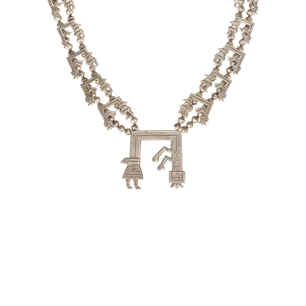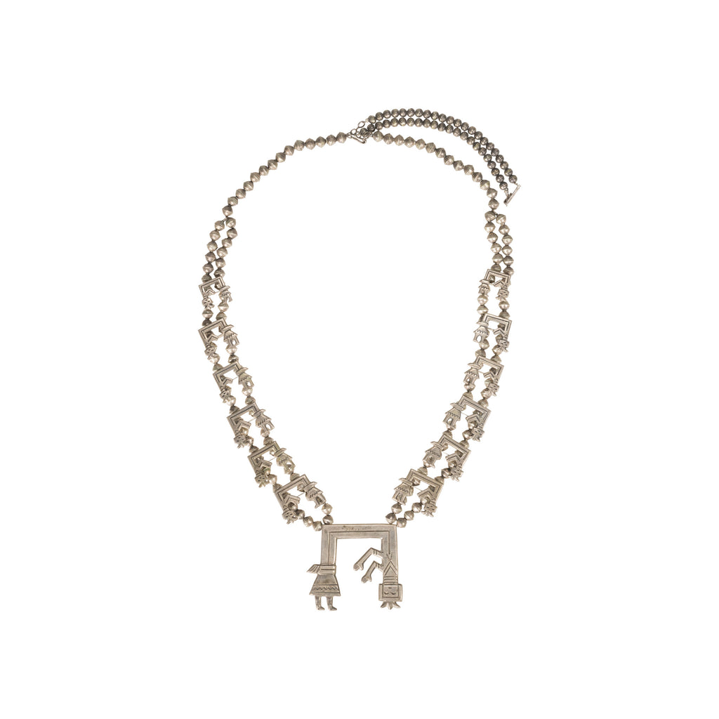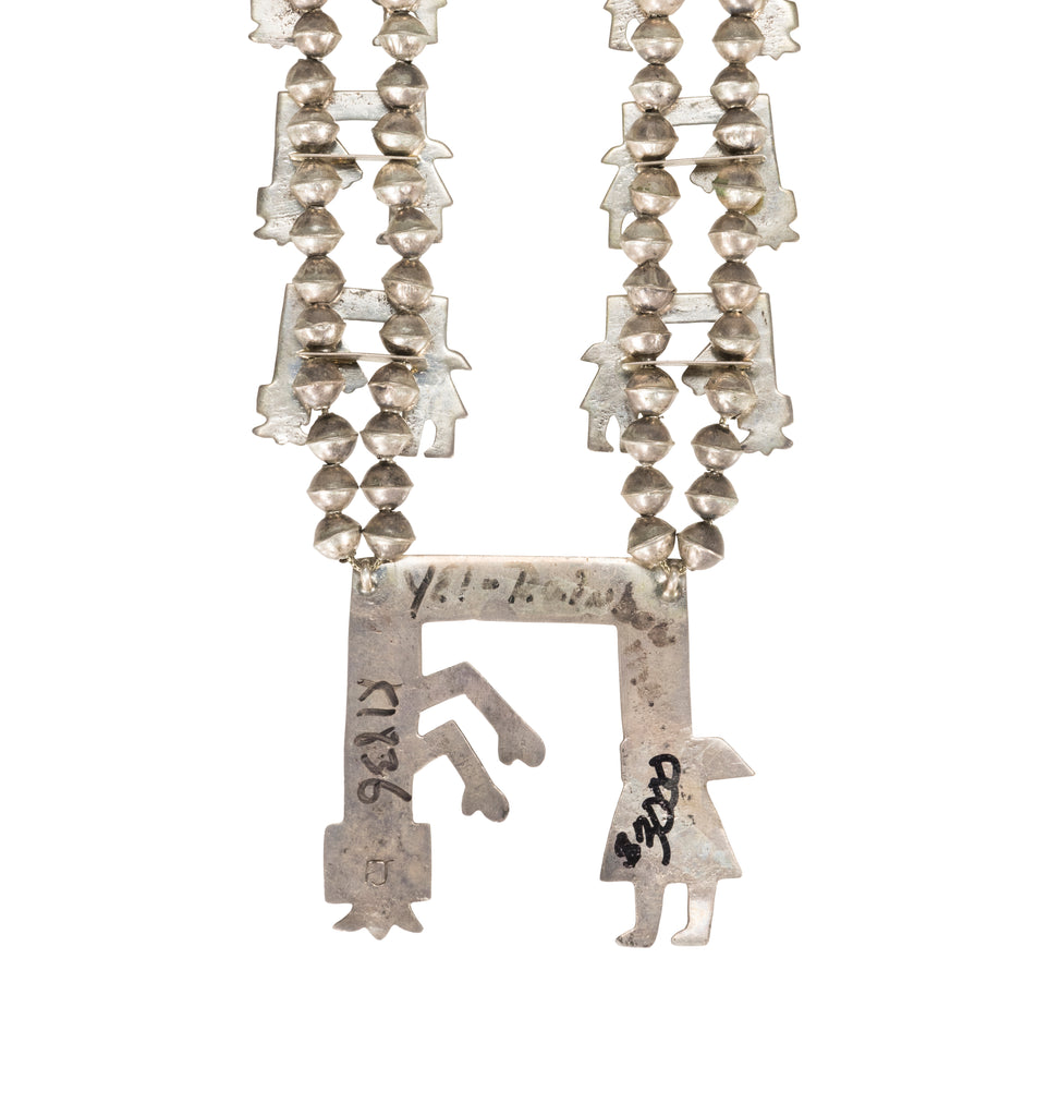 Navajo Yei rainbow sterling squash blossom. Ten Yei rainbows plus a larger one for the Naja. Old Pawn. Acquired from an individual who purchased directly on the reservation.