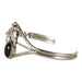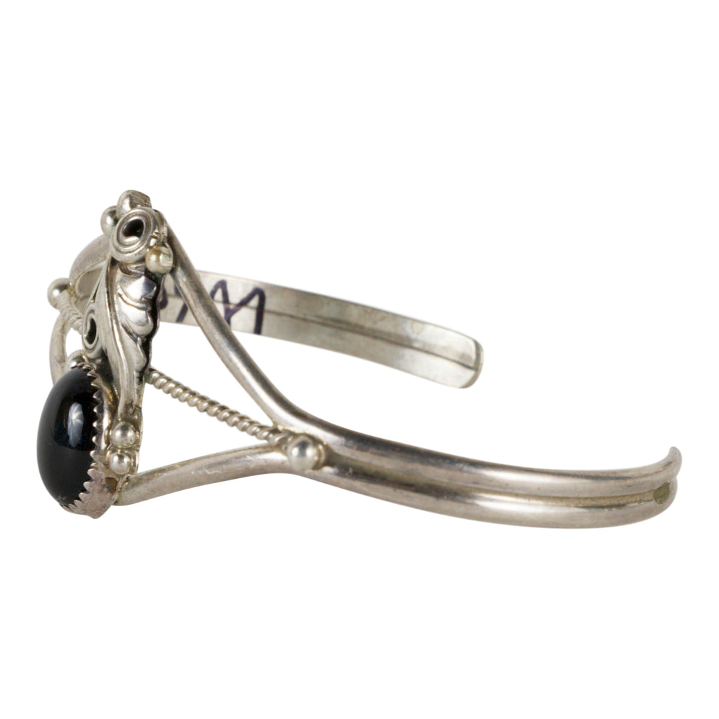 Onyx stone surrounded by silver beads, engraved leafs and twisted rope on silver band. Marked "Sterling."
