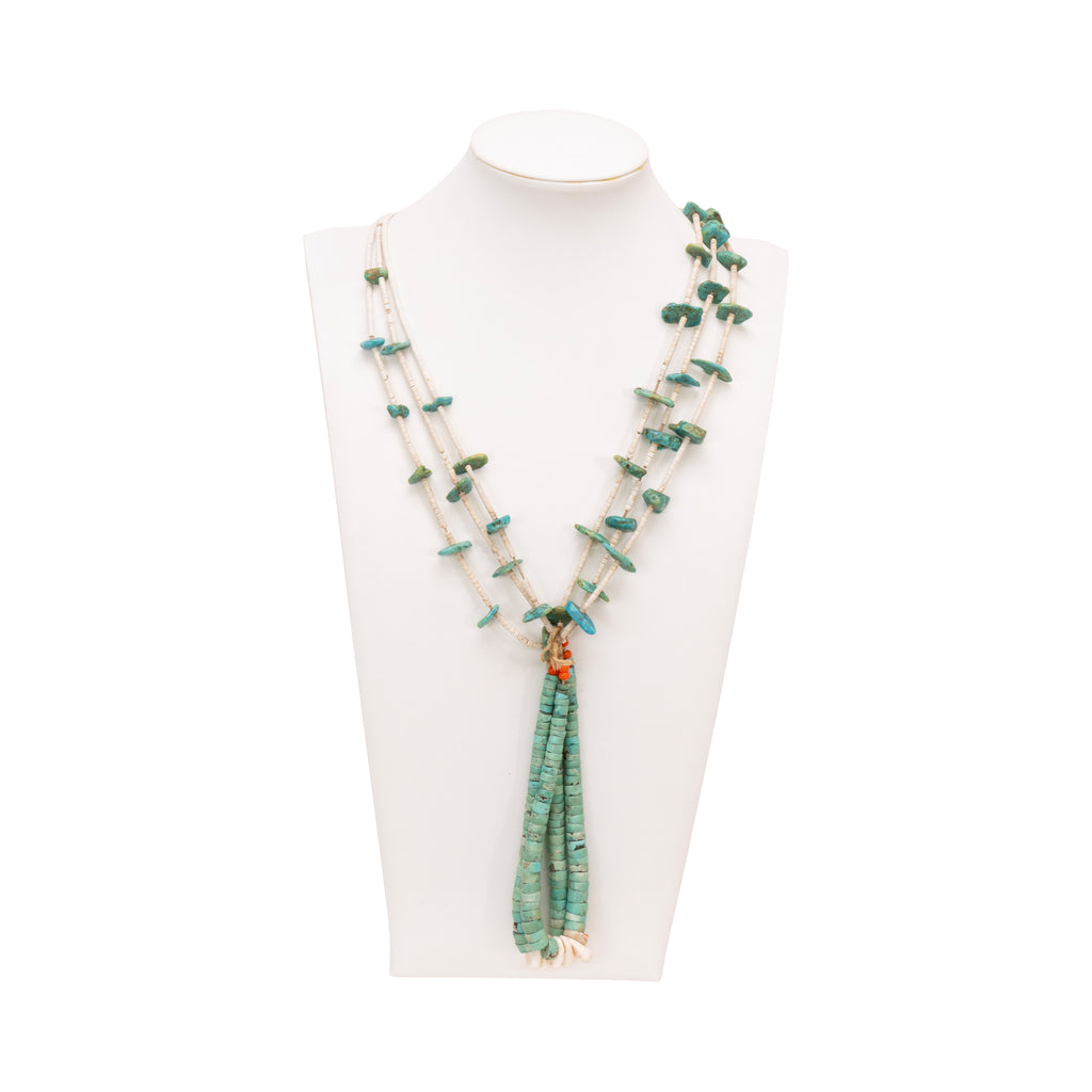 Older Santo Domingo Kingman turquoise and shell heishi beaded necklace with matching turquoise double strand naja drop with hanging shell discs. Wrapped tightly on traditional cording. This piece shows it's age, was made for someone's own use.
