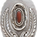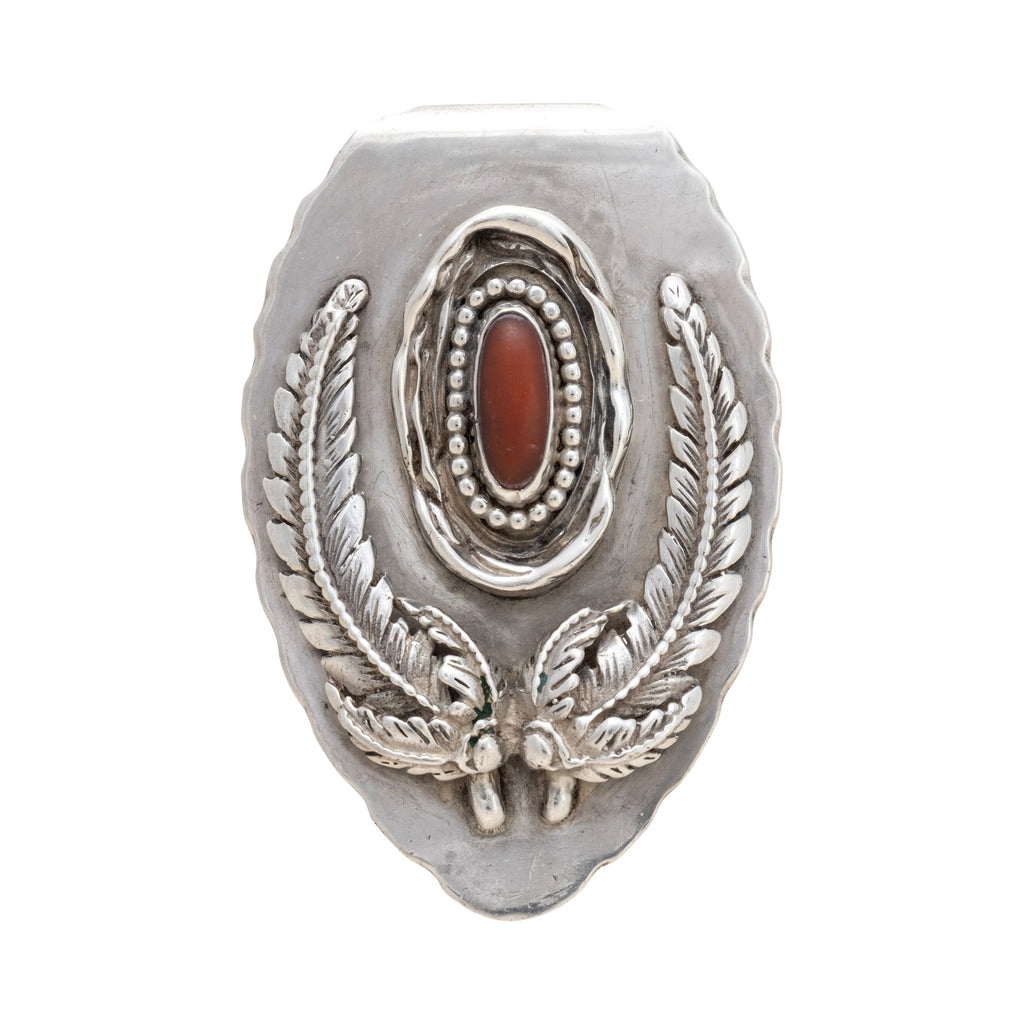 Southwest coral and sterling silver pendant. Natural, untreated stone set in shield design with bordering leaves. No maker's mark. 52.31 grams, 2 3/4" x 2"