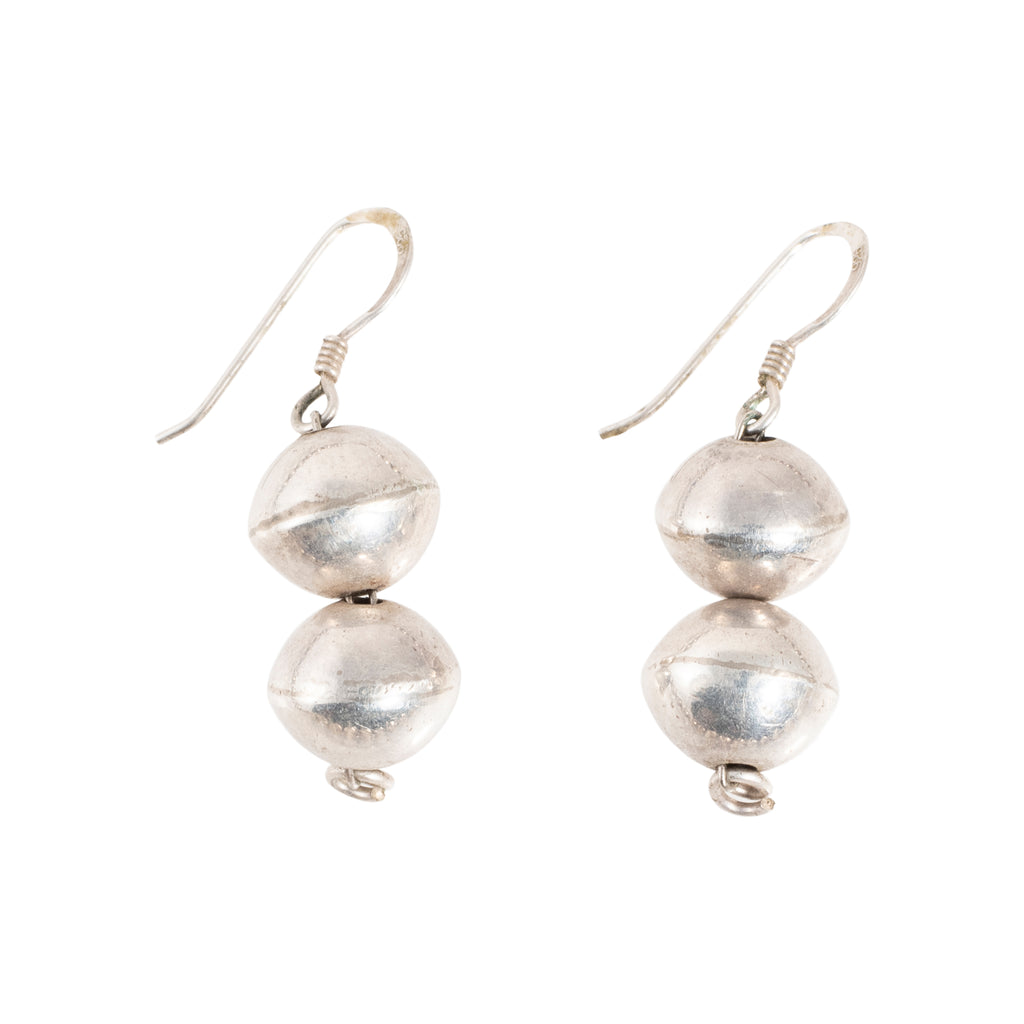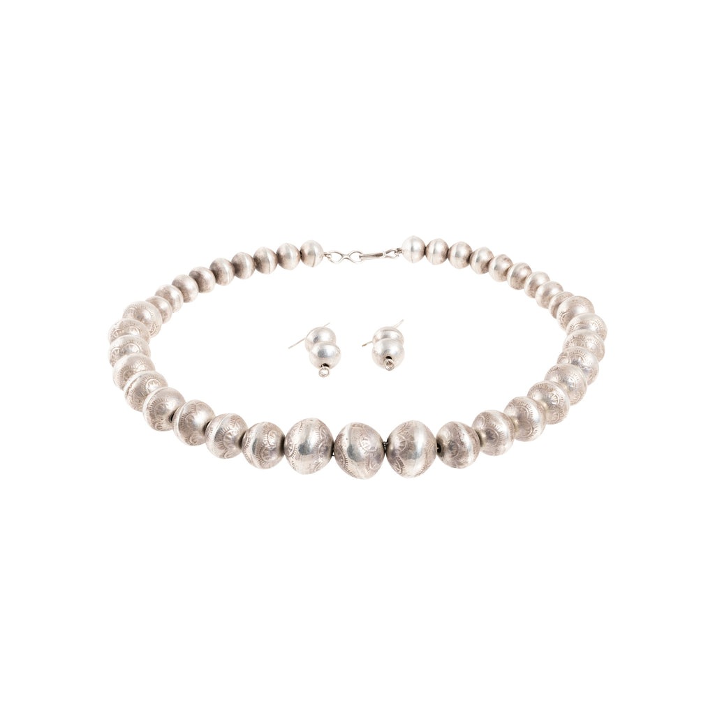 Sterling beaded necklace with earrings. Beads having hand stamped palmette designs. Earrings smaller with solid design.